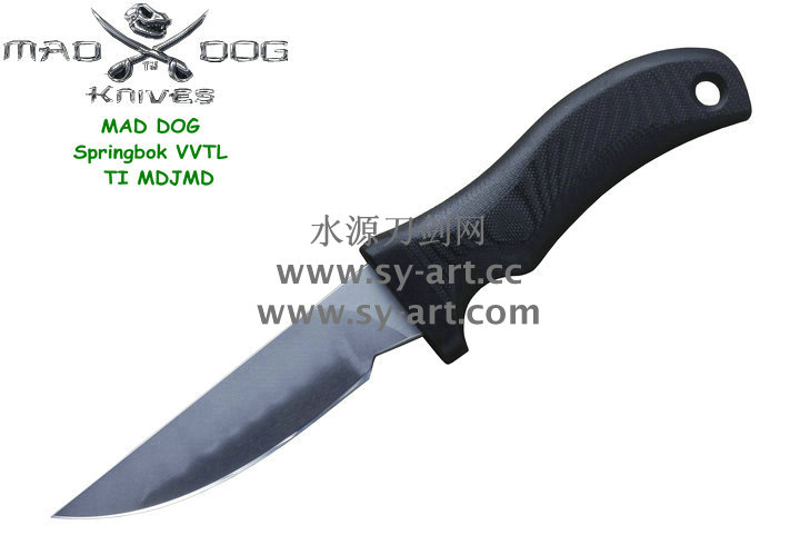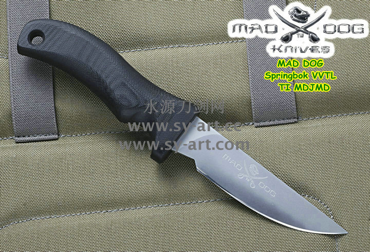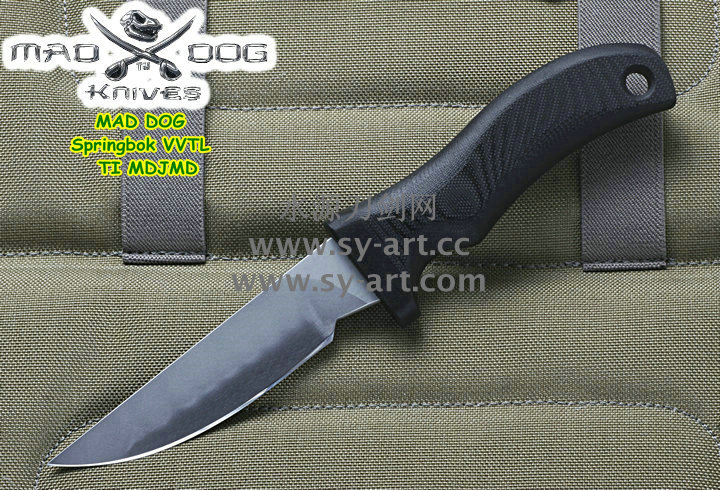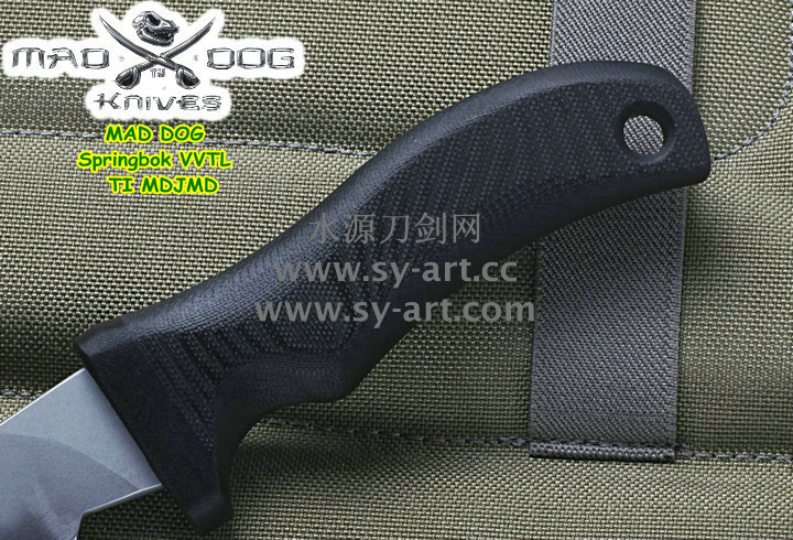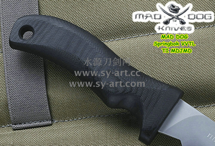 它的手柄符合人体工程学设计,把握极其舒适称手。食指凹槽让使用者即使看不见也能凭手感找到握刃的位置。材料使用特殊的玻璃纤维与环氧基树脂合成来做刃的握柄。此种特殊材质每一平方英寸可承受79000磅的压力(约3600公斤),可以轻易地承受0.45口径子弹的冲击。因此Mad Dog刃的握柄就算很严苛的使用也不会造成损害。此种握柄材质同时也提供了极好的绝缘,每0.001吋可承受1000伏特的电压,因而可以保护持刃者不会在使用刃具时遭受电击。另外这种握柄材质也几乎不受化学物质的渗透及侵蚀。