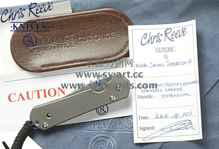 类 型: 折刃 型 号: Small Sebenza 21全 长: 175mm 刃 长: 75mm闭合长度: 100mm 刃 材: 托马斯阶梯不锈大马士革钢 表 面: 酸洗硬 度: 60-61HRC刃 厚: 3mm柄 长: 100mm 柄 材: 钛金属6A14V锁 型: 框架一体锁 重 量: 85g 原产地: 美国当chrisreeve完成了全钢一体刃的制作后,兴趣就转到如果把一体刃的坚固细致精神延续到一把Reeve折刃上。当chrisreeve看到线锁结构后,即对线索结构的简单实用而认可,又不能接受线锁过于薄弱。Reeve仔细分析了钢线锁存在的问题,一是钢线锁太厚会失去弹性而无法完成弯曲加锁的功能,二是钢线锁太厚解锁会很困难。找到了问题的症结,Reeve就着手选择可以避免上述问题的线锁材料,而钛合金正是最佳材料(6铝4钒钛合金90%Ti、 6%Al4%V、)。因为钛合金经过合适的热处理,具有很好的记忆性和弹性,能记忆确定弯曲的弧度,能很顺滑地完成加厚线锁上锁解锁这一概念的机械动作。但只加厚线锁Reeve并不满足,因为热处理后的钛合金硬度仍然不能和钢相比,于是Reeve还在钛锁片的顶端,镶嵌了超硬质合金,来确保线锁到达耐磨损的极限。这个小细节,是所有喜欢SEBENZA的朋友必须特别注意的,也是体会Reeve折刃过人之处的重点。但如果线锁加厚,手柄也会相应增厚,再加上贴片会更重。刚巧的是,钛合金本身只有同样体积钢的一半不到的重量。于是,Reeve索性将加厚线锁同手柄概念合二为一。整块钛合金加工成钛锁片加厚,同时修整出手柄的外形。这就是Reeve的伟大发明——一体式锁(Integral lock)。同时,钛合金也不会生锈。而且表面能缓慢产生的氧化层来覆盖以前的表面磨损。这个延续全钢一体刃坚韧细致概念的折刃设想,就这样由Reeve凭借自己认真的分析,合理的选材和创造性地设计而变为现实。这一切来的即美妙也很自然。直到今天,SEBENZA仍然是最坚固的折刃之冠。SEBENZA在Reeve家乡南非的祖鲁话里,是“工作”的意思。除了设计出最坚固的一体锁,Reeve还设计了最简单也最实用的矛形无假刃刃身。而且刃背被处理成圆滑,这在所有量产刃里是绝无仅有的,就凭这个细节,就能看出SEBENZA的细致之极。SEBENZA先后使用过ATS34,BG42,最后确定为S30V。 S30V有更好的防锈性能,更稳定的热处理效果,而且锋利保持度也是目前钢材里最好的一种。最后,Reeve以自己深厚的艺术修养和特殊的刃具审美感,修饰了SEBENZA手柄外形和及整体协调。这使得一把坚固的工作刃呈现出少有的绅士风范。即使在最正规的场合出现,SEBENZA一样显的幽雅而内敛。SEBENZA无论是配带在黑色礼服里,或是别在战术背心上,都是那么自然妥贴。而无论是开信封切雪茄,或是和敌人格斗,SEBENZA一样耐用、锋利和致命。最后,我们来总结一下SEBENZA。钛合金、加厚、硬质合金头这3点造就了最强壮的锁定。S30V、矛尖无假刃和圆顺的刃片,造就了最锋利和实用的刃身。最后自然流畅的外观线条,完成了这一切美感的升华。一把小刃,却能看到无限的风景。集大成于一只小小的、却又是如此幽雅平实的折刃。突破陈规、挑战极限,是Reeve最大的自豪。而伟大的设计也始终历久弥新。Chris Reeve 是手工刃界呼声最高的制刃师,以高水准的直柄刃和叫做Sebenza的边锁折刃而闻名于世,Sebenza具有一种独特的锁定装置,被称为Chris Reeve 整体锁。Chris Reeve来自南非的海港城市德班,从1975年开始制作手工刃,1984年成为一名职业刃匠。五年后,他做了一个自成为职业刃匠之后的最重大的决定:带着全副身家背井离乡来到美国,因为这里的发达的技术和信息可以令他的制刃技术如虎添翼。在离开南非之前,Chris Reeve已经积累了13年的刃具制造经验,这些从实践中学到的全面的技能无疑为他到美国之后的发展奠定了坚实的基础,使Chris Reeve刃具公司不同于大多数其他刃具公司的一点,就是刃的品质、表现和价值。Chris Reeve刃具都非常强劲而耐用,经过广泛地测试后才出厂。每把刃都具有独特的设计,采用顶级质量的钢材,用手工方法精工细作地制造而成。今天,Chris Reeve刃具仍然是小规模生产,Reeve将所有心血倾注在其设计中,并保证每一把Chris Reeve从离开爱达荷州博依西的商店那一刻起就享有终身免费保修,他对刃具的关怀并不仅止于出售时。对拥有Chris Reeve刃的原始顾客,不论他们用了多久,Reeve都会精心地为他们重新打磨,或为直柄刃重新作表面处理,这些服务都是免费或象征性地收一点。所以,Chris Reeve的顾客都能放心地使用他们的刃,并且能使刃具常年如新,不损收藏价值。很多买手工刃的人都认为产品的品质与刃匠的个人修养密不可分,在这方面Reeve是个真正的绅士,可以真正感受到他亲切和诚恳的个性,他对每个停在他的展台前的人都报以友好的微笑,详细地回答每个问题,再加上品质超群的产品,他简直算得上是制刃业的“超人”。