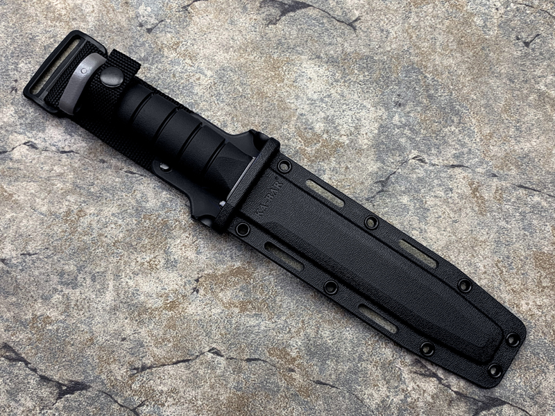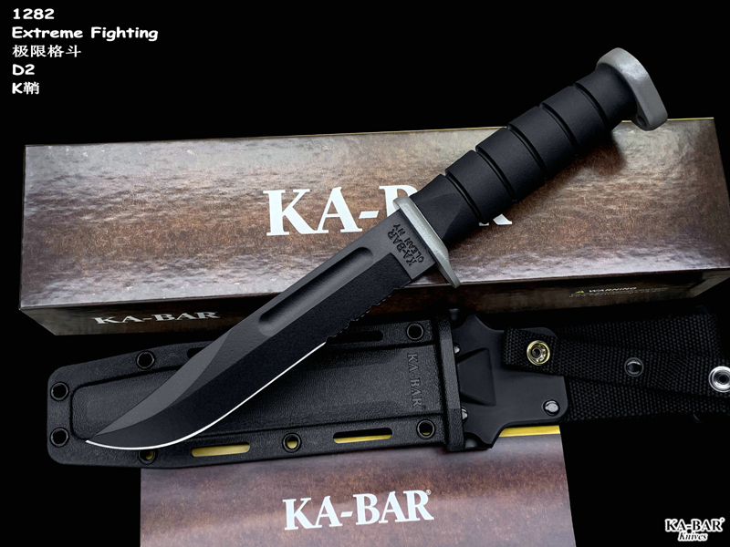 全长: 309mm 刃长: 179mm 刃材: D2 硬 度: 59-60HRC 刃厚: 4.2mm 刃宽: 31.5mm 表面: 黑色环氧涂层 柄材: Kraton 重量: 340g 原产地: 美国 美国首都华盛顿广场上,有一座巨型雕像,五名海军陆战队的士兵正奋力插起一面美国国旗(刃上LOGO画象)。这座雕像是根据美联社记者乔?罗森塔尔拍摄的一张二战著名照片塑成的,而这张照片表现的正是硫磺岛上的血战。 历史悠久之刃厂,着名於军刃、刺刃、格斗刃等,美国海军陆战队在韩战、越战时采用之军刃。KA BAR Knives, Inc 总公司Alcas Corporation是国际名刃具工厂,世界知名出品有U.S.M.C.战术刃、打猎刃、鱼刃、收藏刃等… KA BAR 刃厂总部成立于美国纽约,曾於1998年庆祝其公司成立100周年。 Ka-bar刃厂以前叫做Union Razor Co.,被称为Ka-bar 是由于一位猎人的推荐信函。这位猎人在打猎的途中遇到了熊,子弹用尽的他只好拿起了他那由Union Razor Co.所造的高品质猎刃来与熊搏斗,因而保住了性命,他在信上写到这把刃可以杀熊(Kill a bear ),但是因为这位猎人的教育层度不高,将它写成Kil a bar,后来又被人们缩写成Ka-bar,因此Ka-bar这个名字便被大家所传颂,甚至比Union更有名气,因此在1951年时,Union Razor公司正式改名为Ka-bar ,但在此之前Union公司便已在他们生产的刃上打上Ka-bar的标志。 自1942年二次大战爆发不久,KA BAR刃厂提交首批軍刃與U.S.M.C. (美国海军陆战队) 队员使用。军方于3年后,公元1945年确认其军刃之可靠性能,而把该刃命名为U.S.M.C. Fighting / Utility Knife "美国海军陆战格斗及多用途刃",而其它武装部队也开始被建议采用此刃。 KABAR生产了共超过一百万把军刃,曾在供不应求之情况下,KABAR刃厂直接受权予其他生产商生产其他类型之军刃给各军队使用,及在刃上印上其他生产商之名称,但出厂的每一把刃也被认为名符其实是KABAR军刃 ! 是因为基於它的质量和耐用性,获很多使用者对此刃之信赖,作为日常工作之用 -- 例如修理装置、挖狐洞、磨利帐蓬支柱、开罐头和最重要是在战乱时代作为一种防身利器。KABAR 军刃的知名度於二次大战後大大提高,其後於韩,越战,沙漠风暴等战争中也被积极采用。 KA-BAR以生产直柄刃闻名于世。美国KA-BAR卡巴公司少量新刃型号在公司台湾基地生产,但基本所有产品都在美国基地生产。美国KA-BAR刃具公司产品全部从美国进口。军警人员采用。 1800年代末期,纽约西部及宾州北部地区。当时有超过30家以上刃厂的规模。但随着不断地淘汰及经济上的冲击,目前只硕果仅存了少部份质优的厂商。而KA-BAR刃具公司就是其中之一。直到1996年经过纽约州奥林市的阿卡斯公司机(Alcas Corporation)重整。KA-BAR刃厂现在在产品的制作、研发、创新及客服上都更广得回响,产品优越品质为大众所认同。以阿卡斯角族的决心魄力,KA-BAR刃厂必能更上一层楼。
