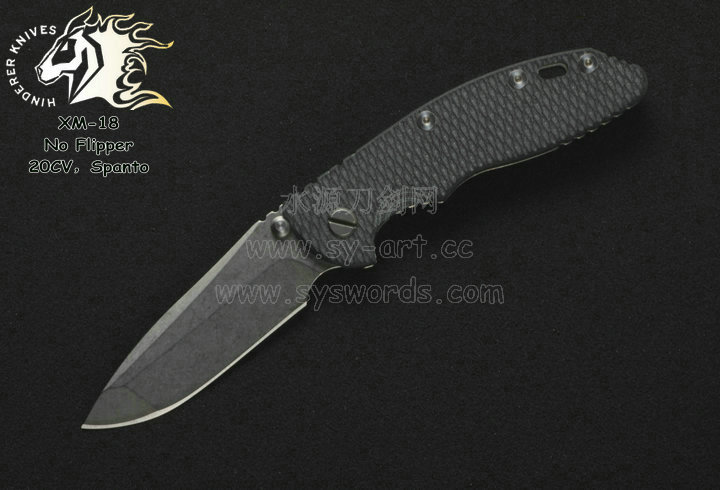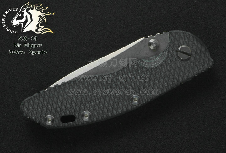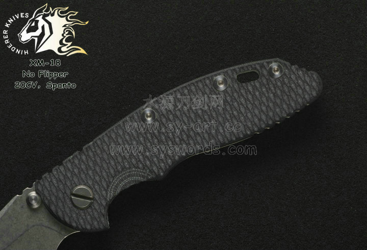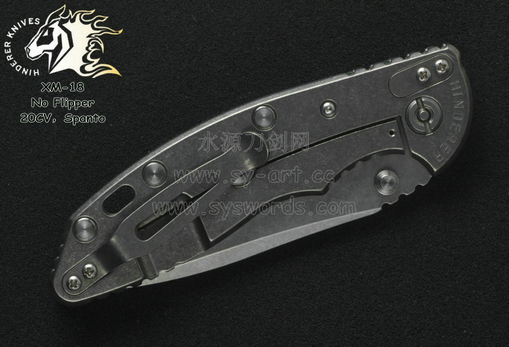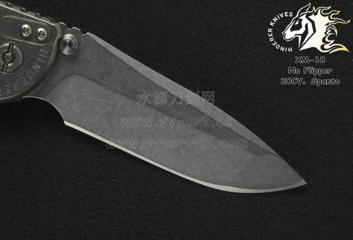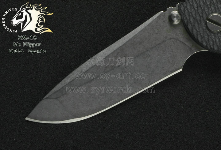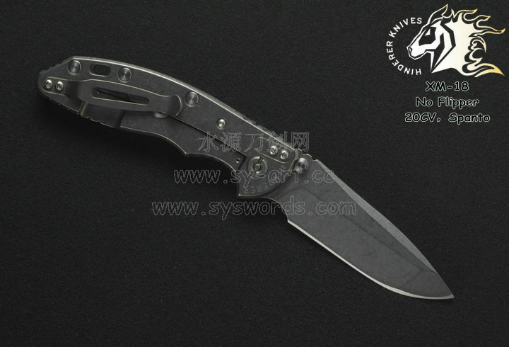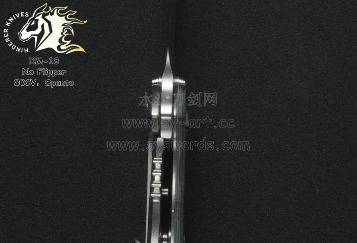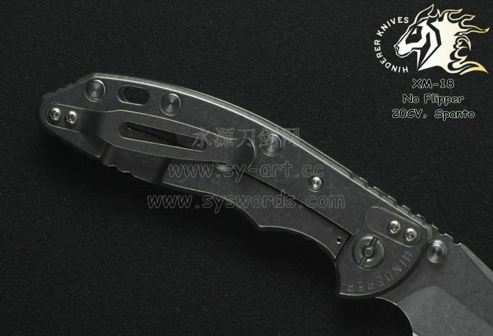 类 型: 折刃 型 号: XM-18 3.5吋 全 长: 209mm 刃 长: 89mm 刃 材:20CV 硬 度: 60-61HRC 刃 面:石洗 刃 厚: 4.2mm 柄 材: 钛金属6A14V+黑色G-10 重 量: 161g 原产地: 美国 锁型: 一体锁 XM18的设计是完全复合现今时代进步科技含量的产物。 专利刃头,独特的Spanto,既有传统水滴刃头的切割功能,又秉承了Tanto刃头的不俗穿刺能力。 专利止刃柱,区别于传统的止刃系统,从而更好更安全的定位和止刃。 专利锁定稳定器,很早的专利设计,很多厂商和手工刃匠都从Hinderer手里买代理使用权,具有代表性的是Strider的SMF/SNG系列。 专利背部间隔柱,独特的鼓型设计更有效更强壮的承受和分摊压力,他曾经的视频是用重型卡车来回碾压XM18,之后还是完好无损的结构。 专利的辅助开刃护手设计,Flipper的辅助开刃功能大家都不陌生,Hinderer的独特设计更改了传统的Filpper,加入护手理念的结合,创造出了XM18独特专利的辅助开刃护手Flipper。 专利的双向更换背夹设计,这点不用多说了,方便各种人群的需求无论喜欢Tip-down/Tip-up或不要背夹都可以满足需要。 独特的简单手柄贴片更换功能,从而满足更多玩家需求,按照自己喜好简单DIY。