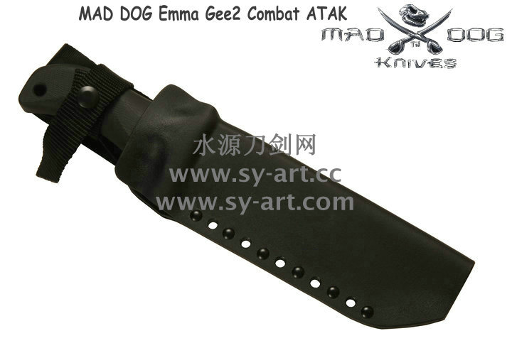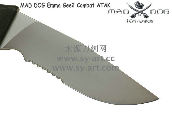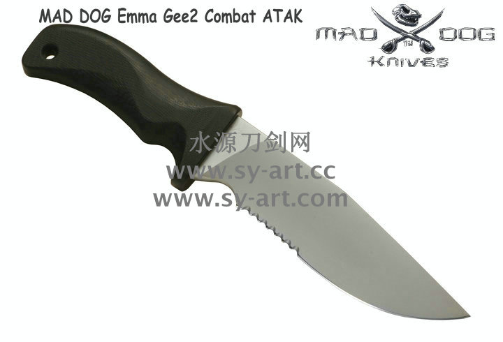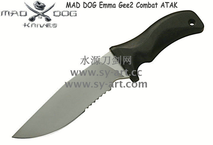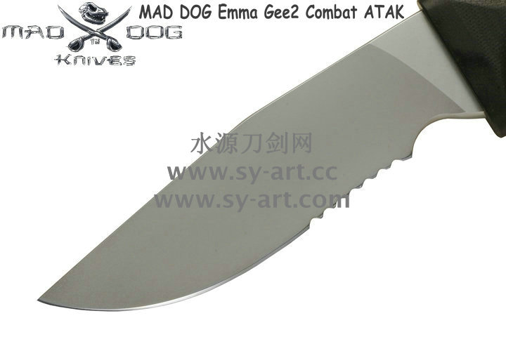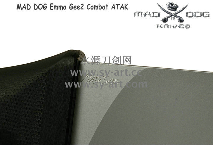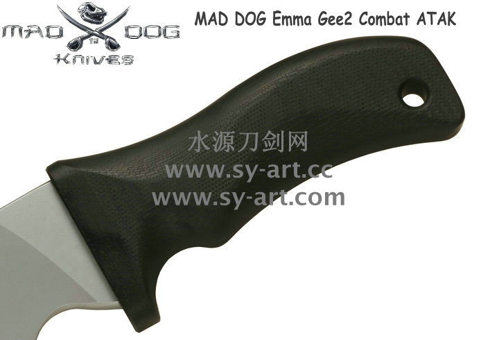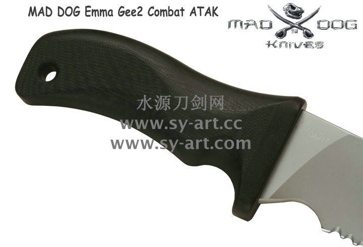 Mad Dog刃具的手柄都经过人体功能学设计,形状独特,把握极其舒适称手。它的食指凹槽让使用者即使看不见也能凭手感找到握刃的位置。手柄材料是一种不公开的黑色环氧玻璃,可承受极高压力和高温,这种材料可以轻易地承受 .45口径枪子弹的冲击,而且几乎不被化学溶剂腐蚀。全隐藏式柄芯,确保使用者在工作时不会触电。