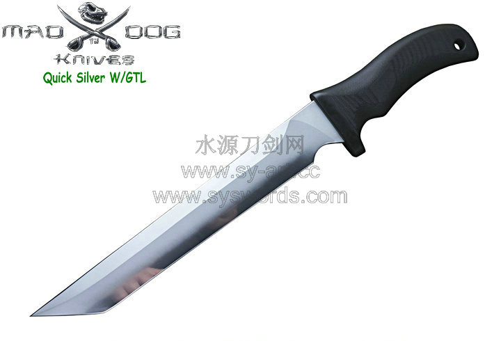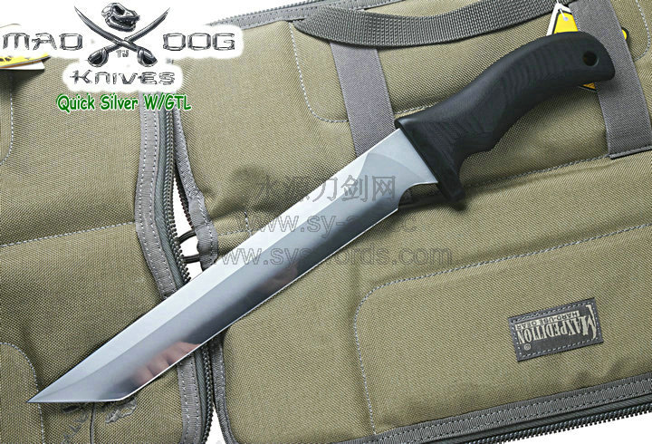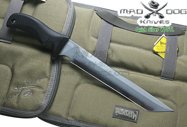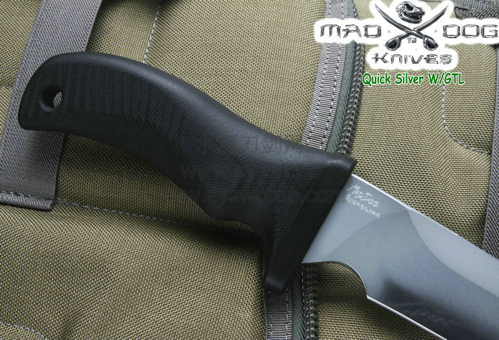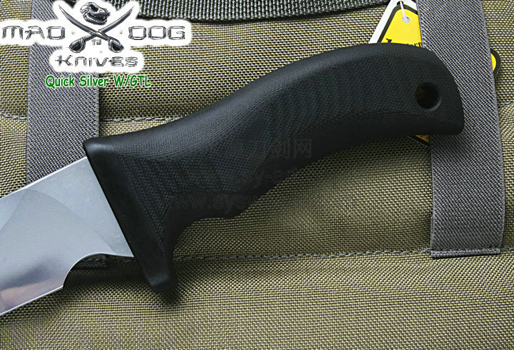 Mad Dog刃具的手柄都经过人体功能学设计,形状独特,把握极其舒适称手。它的食指凹槽让使用者即使看不见也能凭手感找到握刃的位置。手柄材料是一种不公开的黑色环氧玻璃,可承受极高压力和高温,这种材料可以轻易地承受 .45口径枪子弹的冲击,而且几乎不被化学溶剂腐蚀。全隐藏式柄芯,确保使用者在工作时不会触电。