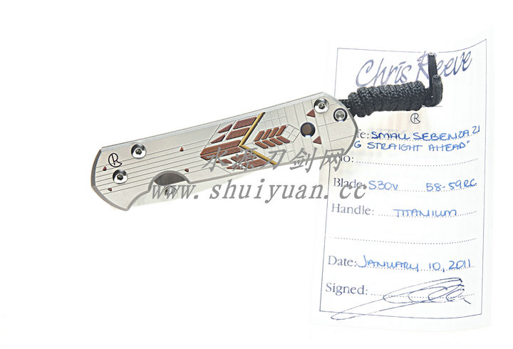 当chrisreeve完成了全钢一体刃的制作后,兴趣就转到如果把一体刃的坚固细致精神延续到一把Reeve折刃上。当chrisreeve看到线锁结构后,即对线索结构的简单实用而认可,又不能接受线锁过于薄弱。Reeve仔细分析了钢线锁存在的问题,一是钢线锁太厚会失去弹性而无法完成弯曲加锁的功能,二是钢线锁太厚解锁会很困难。找到了问题的症结,Reeve就着手选择可以避免上述问题的线锁材料,而钛合金正是最佳材料(6铝4钒钛合金90%Ti、 6%Al4%V、)。因为钛合金经过合适的热处理,具有很好的记忆性和弹性,能记忆确定弯曲的弧度,能很顺滑地完成加厚线锁上锁解锁这一概念的机械动作。但只加厚线锁Reeve并不满足,因为热处理后的钛合金硬度仍然不能和钢相比,于是Reeve还在钛锁片的顶端,镶嵌了超硬质合金,来确保线锁到达耐磨损的极限。这个小细节,是所有喜欢SEBENZA的朋友必须特别注意的,也是体会Reeve折刃过人之处的重点。