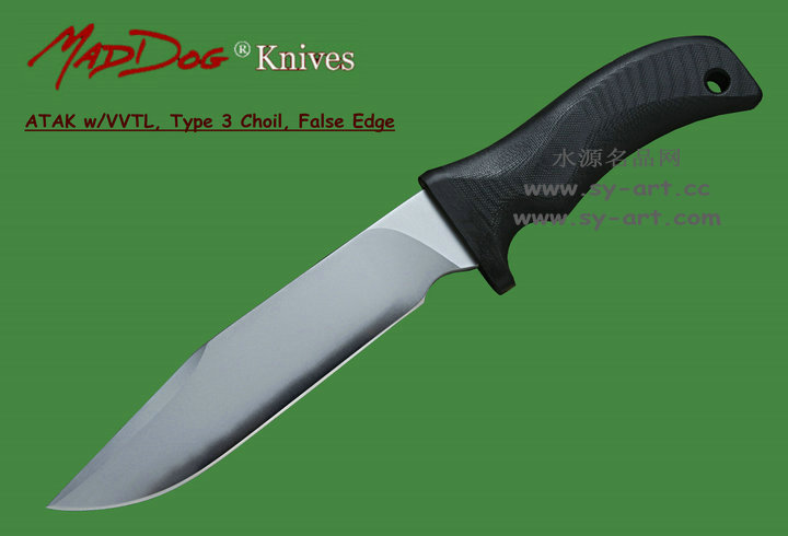 Mad Dog ATAK 疯狗——高级战术突击刃 除了完美之外,实在难以找到另一个词汇来形容Mad Dog Knives刃具。而ATAK更可说是Mad Dog Knives的成名刃。在1992年由西岸海豹部队所做的残酷测试中,ATAK是唯一一把通过测试的刃,测试的内容包括将刃夹在两片木片中,由体重约100公斤的海豹队员握住刃柄来做引体向上的动作,结果ATAK毫发无伤。ATAK是顶级藏家的选择,由于收藏者众,所以千金难求。