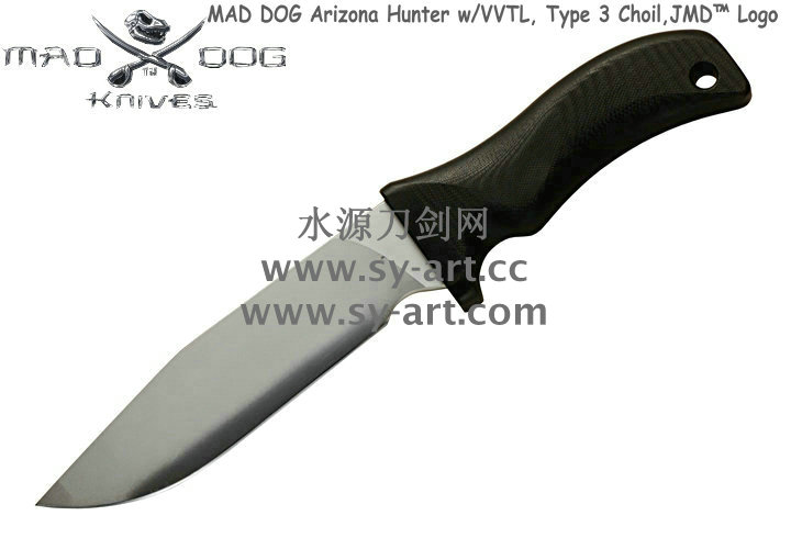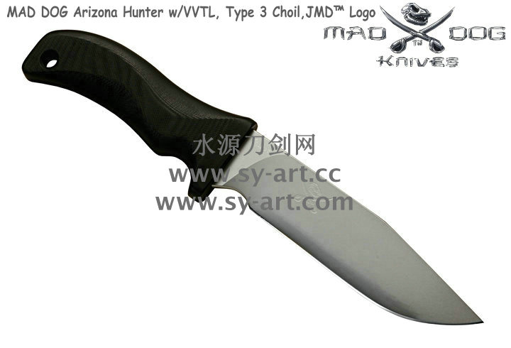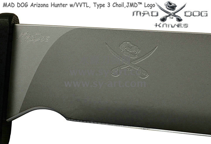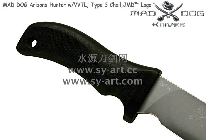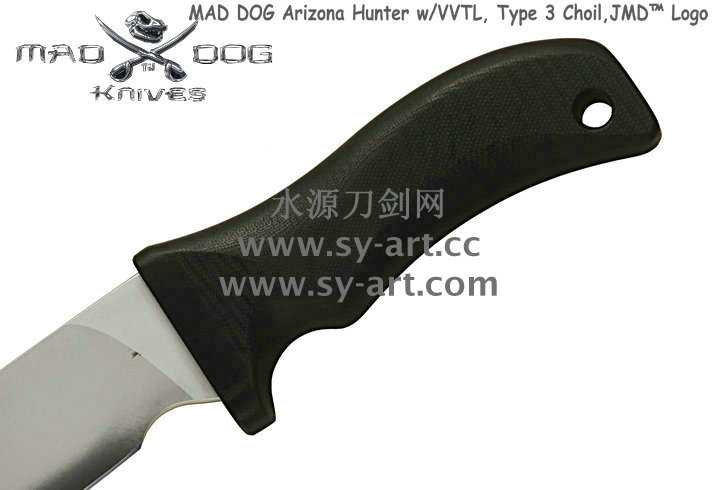 Mad Dog刃具的手柄都经过人体功能学设计,形状独特,把握极其舒适称手。它的食指凹槽让使用者即使看不见也能凭手感找到握刃的位置。手柄材料是一种不公开的黑色环氧玻璃,可承受极高压力和高温,这种材料可以轻易地承受 .45口径枪子弹的冲击,而且几乎不被化学溶剂腐蚀。全隐藏式柄芯,确保使用者在工作时不会触电。