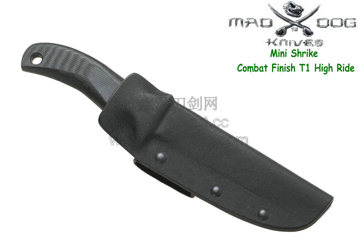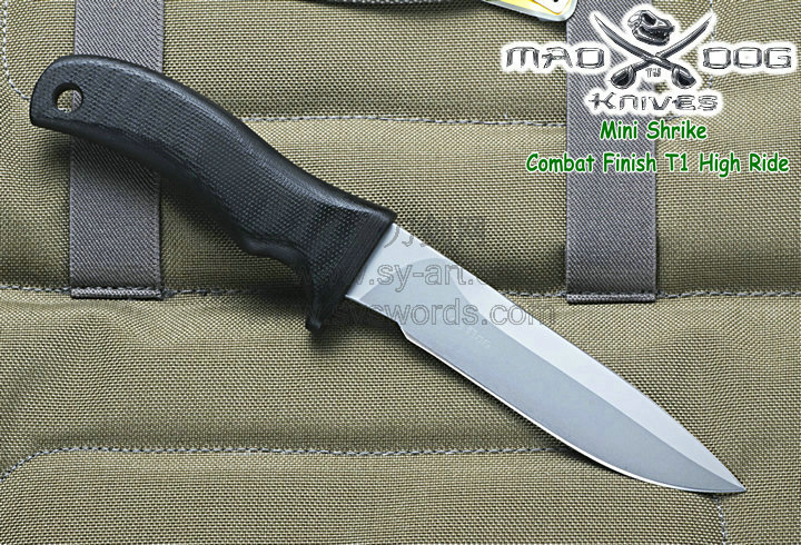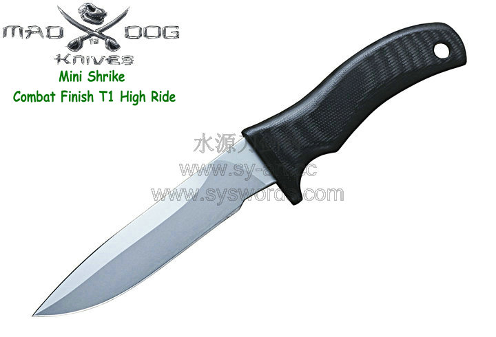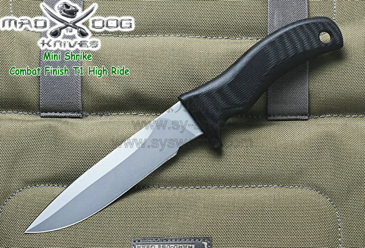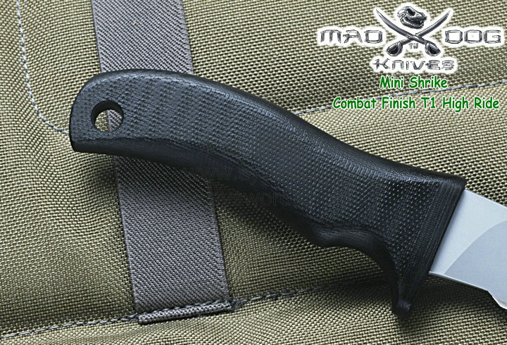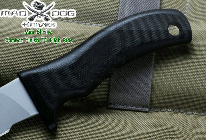 它的手柄符合人体工程学设计,把握极其舒适称手。食指凹槽让使用者即使看不见也能凭手感找到握刃的位置。材料使用特殊的玻璃纤维与环氧基树脂合成来做刃的握柄。此种特殊材质每一平方英寸可承受79000磅的压力(约3600公斤),可以轻易地承受0.45口径子弹的冲击。因此Mad Dog刃的握柄就算很严苛的使用也不会造成损害。此种握柄材质同时也提供了极好的绝缘,每0.001吋可承受1000伏特的电压,因而可以保护持刃者不会在使用刃具时遭受电击。另外这种握柄材质也几乎不受化学物质的渗透及侵蚀。