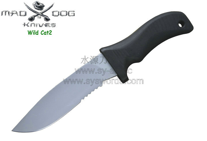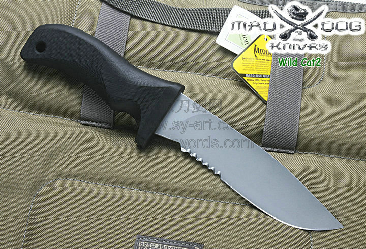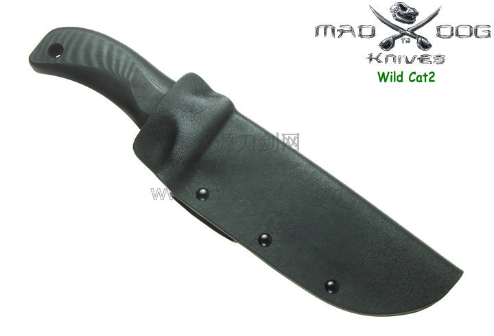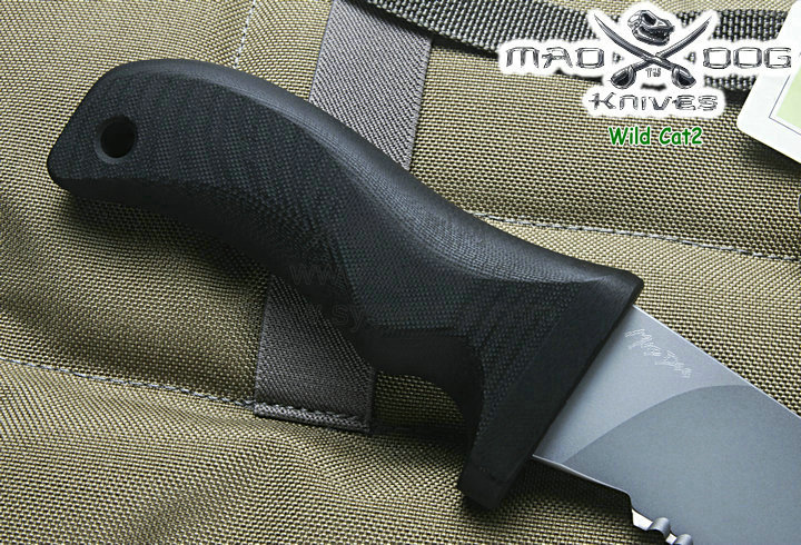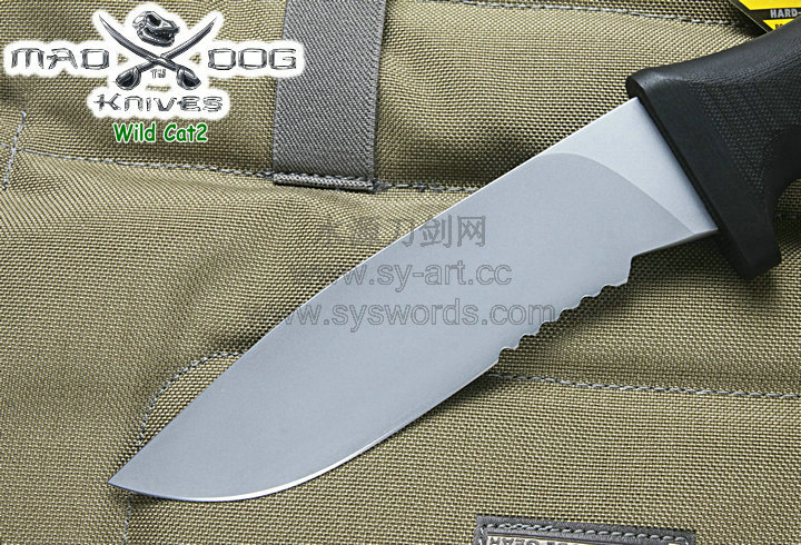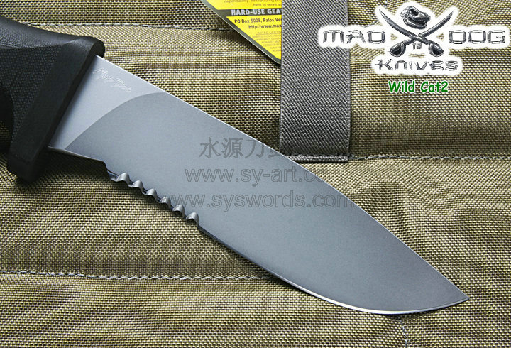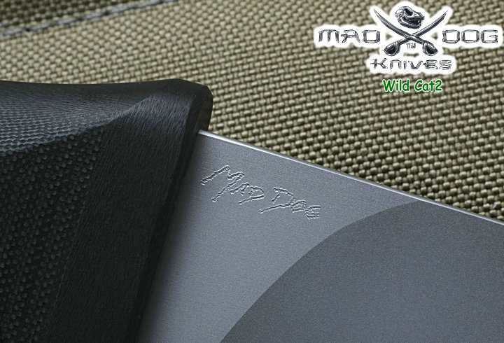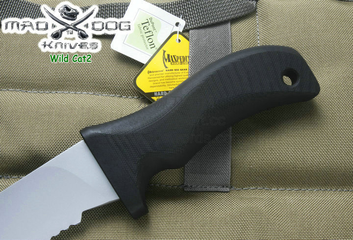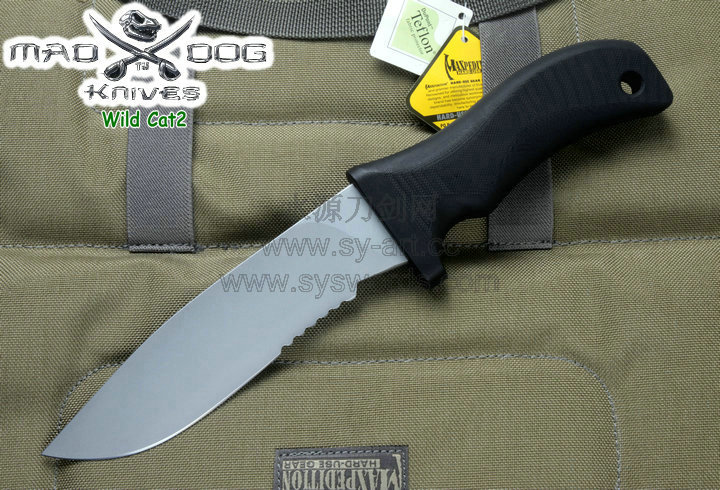 Mad Dog刃具的手柄都经过人体功能学设计,形状独特,把握极其舒适称手。它的食指凹槽让使用者即使看不见也能凭手感找到握刃的位置。手柄材料是一种不公开的黑色环氧玻璃,可承受极高压力和高温,这种材料可以轻易地承受 .45口径枪子弹的冲击,而且几乎不被化学溶剂腐蚀。全隐藏式柄芯,确保使用者在工作时不会触电。