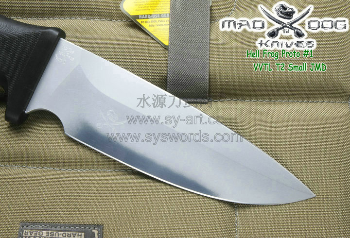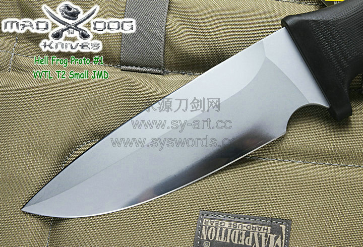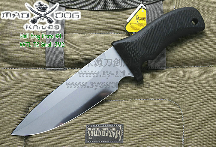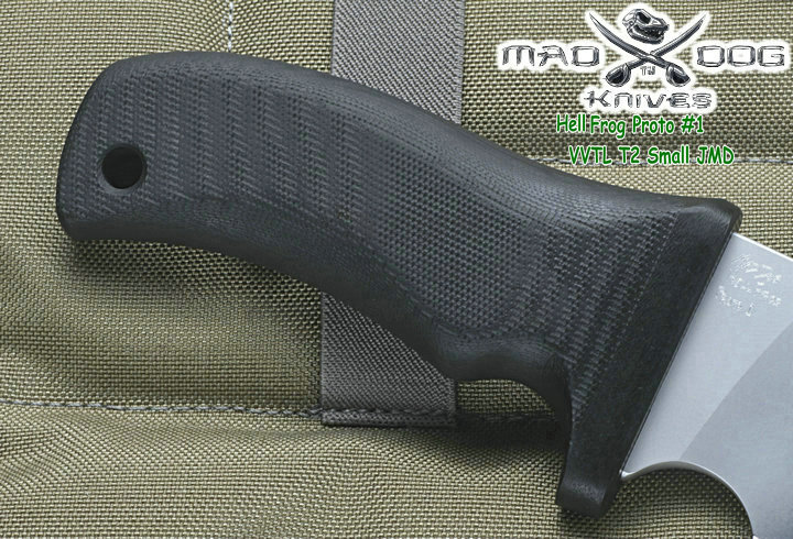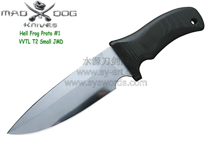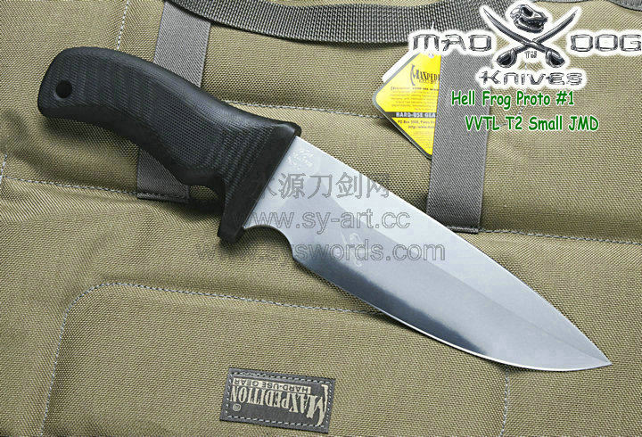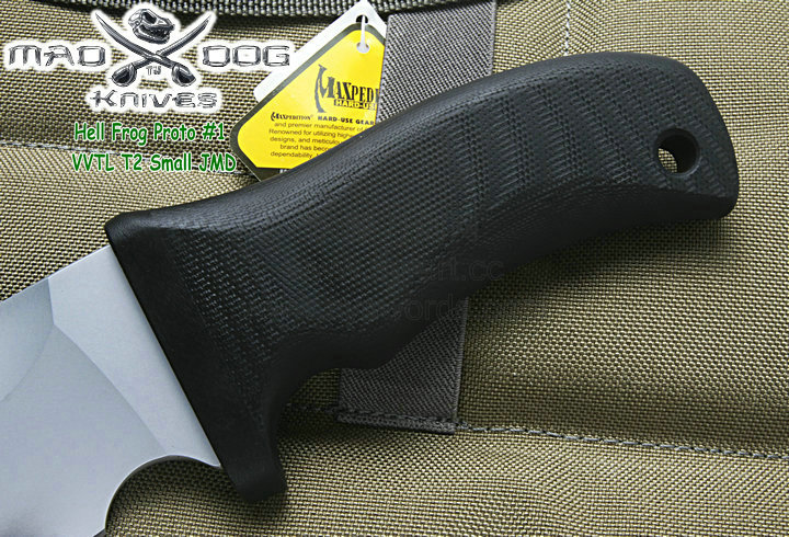 Mad Dog刃具的手柄都经过人体功能学设计,形状独特,把握极其舒适称手。它的食指凹槽让使用者即使看不见也能凭手感找到握刃的位置。手柄材料是一种不公开的黑色环氧玻璃,可承受极高压力和高温,这种材料可以轻易地承受 .45口径枪子弹的冲击,而且几乎不被化学溶剂腐蚀。全隐藏式柄芯,确保使用者在工作时不会触电。