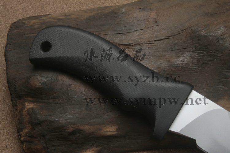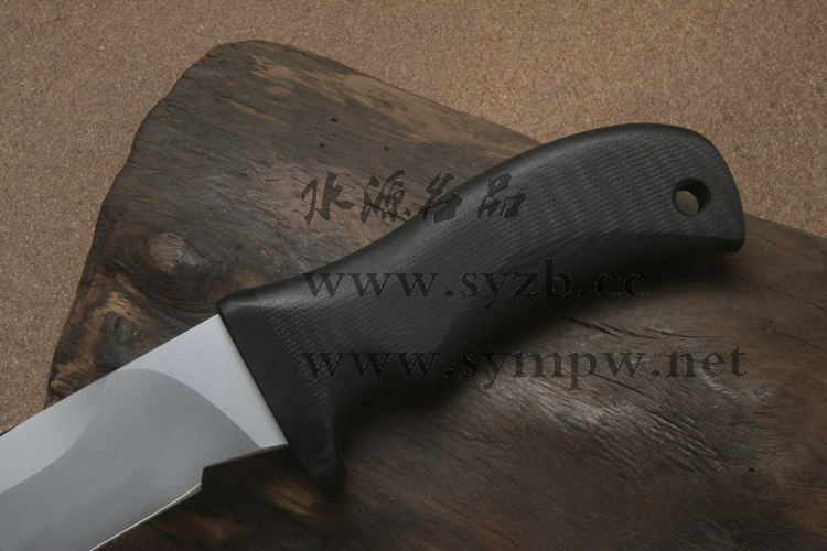 它的手柄符合人体工程学设计,把握极其舒适称手。食指凹槽让使用者即使看不见也能凭手感找到握刃的位置。材料使用特殊的玻璃纤维与环氧基树脂合成来做刃的握柄。此种特殊材质每一平方英寸可承受79000磅的压力(约3600公斤),可以轻易地承受0.45口径子弹的冲击。因此Mad Dog刃的握柄就算很严苛的使用也不会造成损害。此种握柄材质同时也提供了极好的绝缘,每0.001吋可承受1000伏特的电压,因而可以保护持刃者不会在使用刃具时遭受电击。另外这种握柄材质也几乎不受化学物质的渗透及侵蚀。