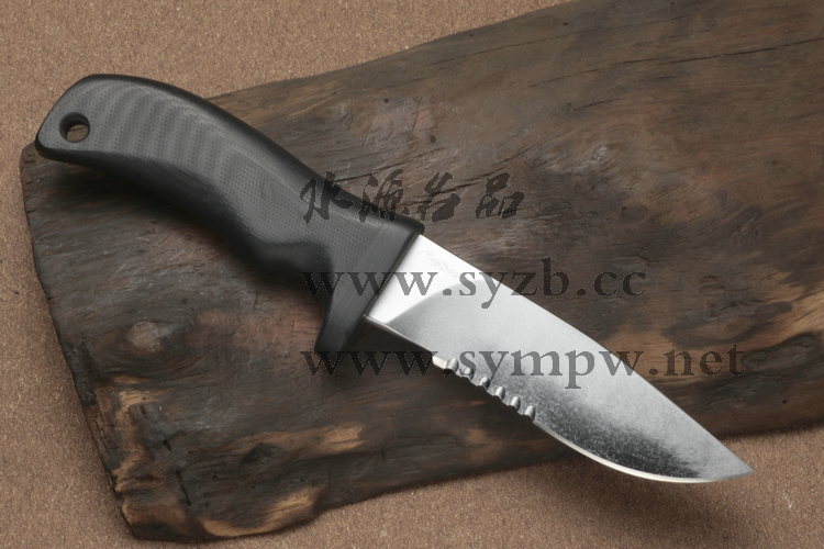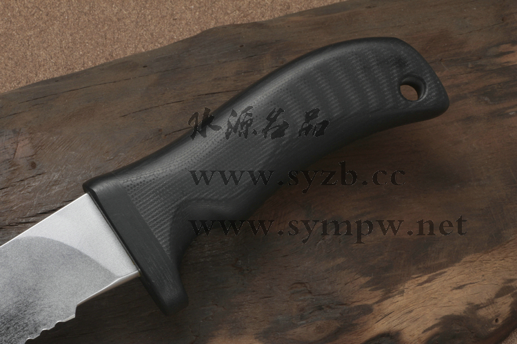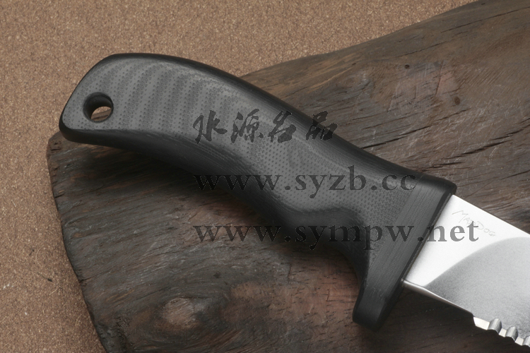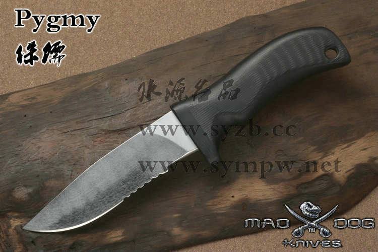 它的手柄符合人体工程学设计,把握极其舒适称手。食指凹槽让使用者即使看不见也能凭手感找到握刃的位置。材料使用特殊的玻璃纤维与环氧基树脂合成来做刃的握柄。此种特殊材质每一平方英寸可承受79000磅的压力(约3600公斤),可以轻易地承受0.45口径子弹的冲击。因此Mad Dog刃的握柄就算很严苛的使用也不会造成损害。此种握柄材质同时也提供了极好的绝缘,每0.001吋可承受1000伏特的电压,因而可以保护持刃者不会在使用刃具时遭受电击。另外这种握柄材质也几乎不受化学物质的渗透及侵蚀。