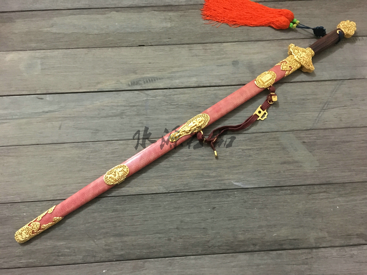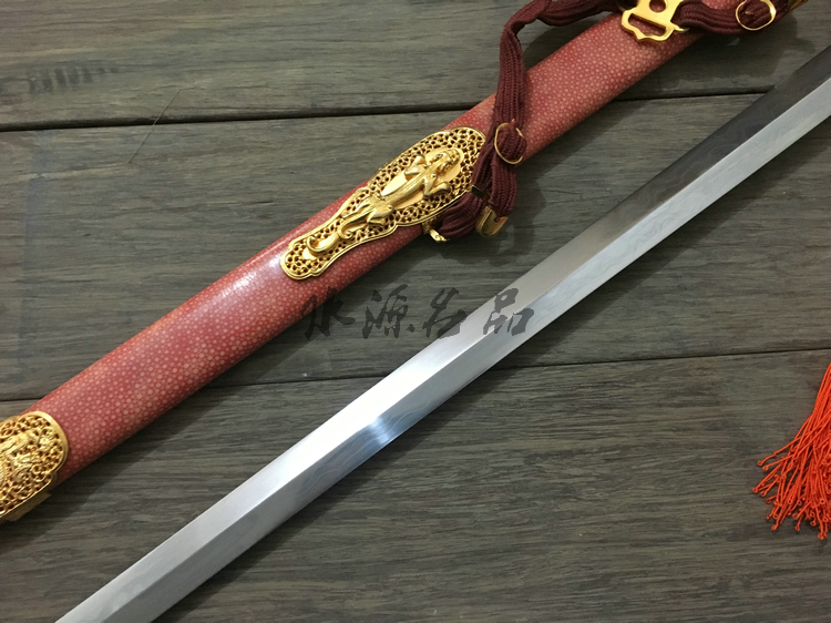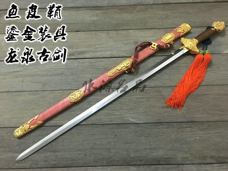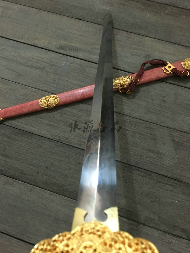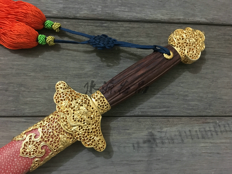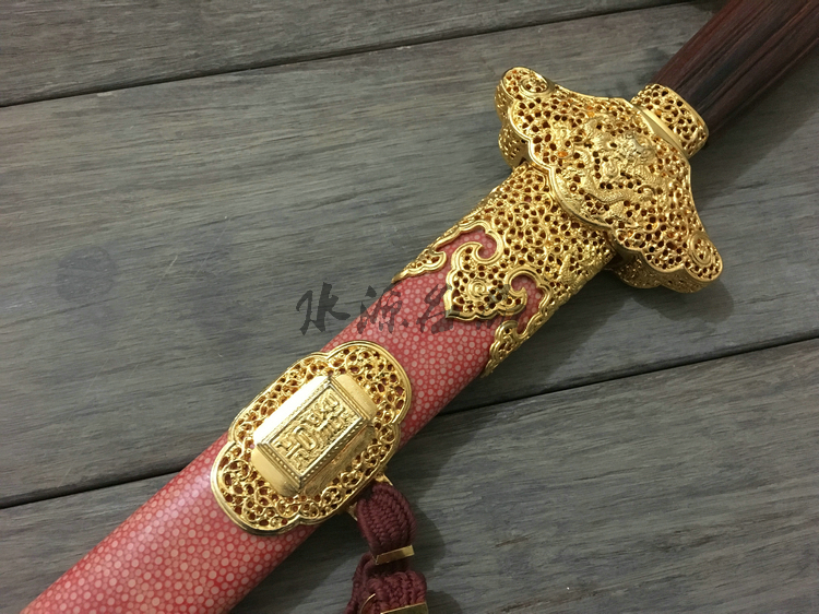 此剑装饰华丽异常,其装具制作工艺复杂之极,在密如针孔般复杂的镂空卷草纹上点缀上花卉纹,并采用先铸后刻的方法在剑格上制出四爪金龙.并配红色鲨鱼皮鞘,富丽堂皇,极具皇家气派.由鞘装上”龙泉”二字推断,此剑应是由皇室从龙泉制剑地区定制,用于自用或赏赐大臣的宝剑.