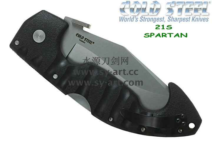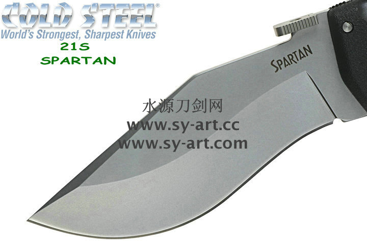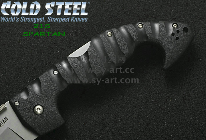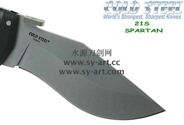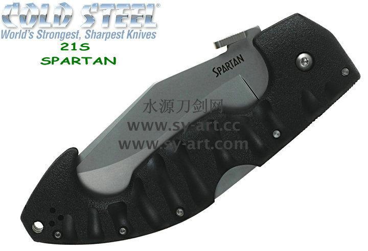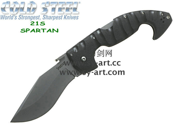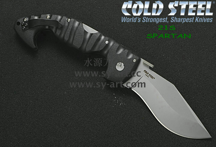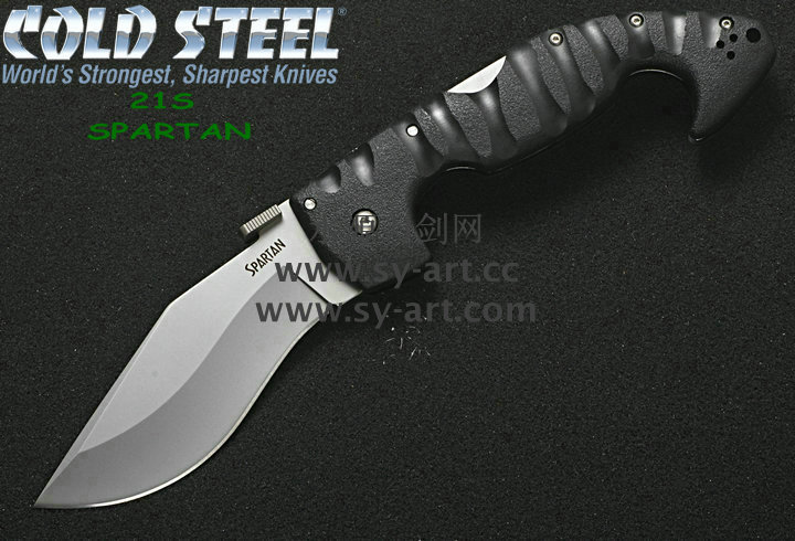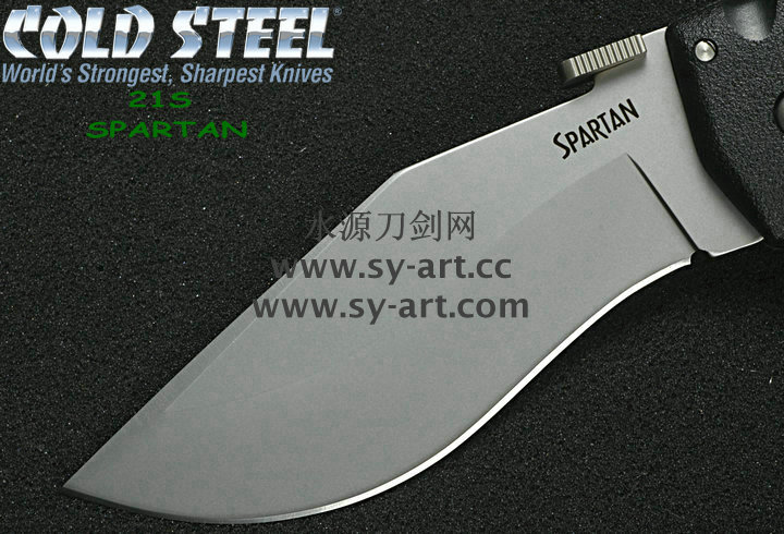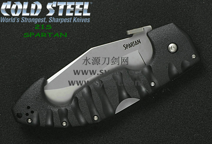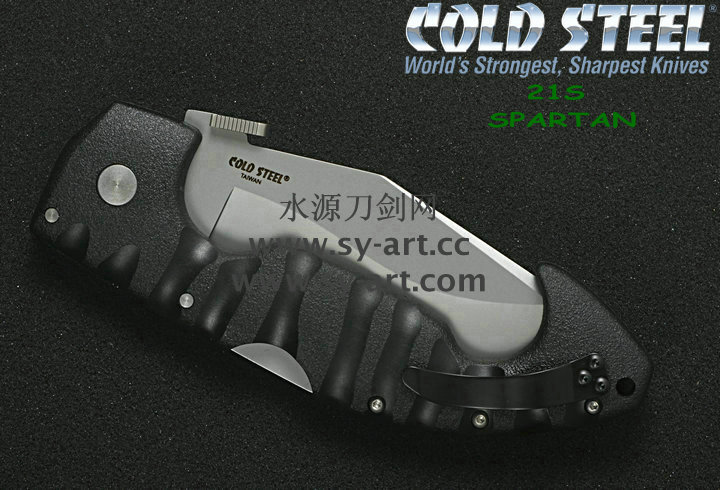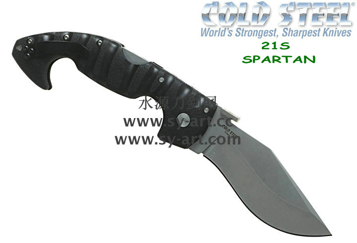 现今Cold Steel刃厂推出此把斯巴达大折刃,外观上撷取喀尔克(Kukri)开山刃与希腊Kopis 刃设计但体积更为精短,长达4吋(约10公分)的厚实刃刃宽度最大可达3.8cm,Grivory w/ Steel Liners 材质握柄设计无论正反握持皆提供绝佳的紧实手感。