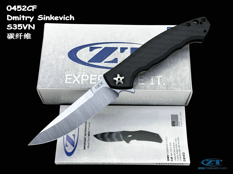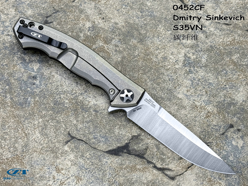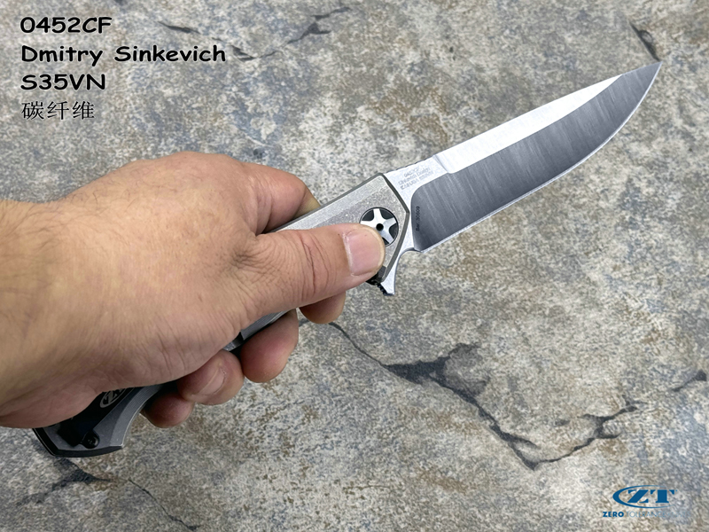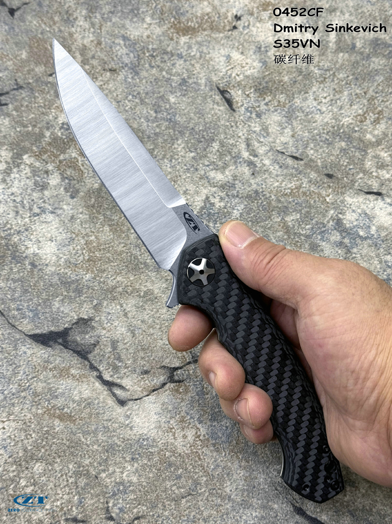 0454是ZT公司与著名刃匠Dmitry Sinkevich的一款屡获殊荣的限量版折刀,产品少价格高,今年ZT公司推出了相同尺寸碳纤维柄的版本0452CF。