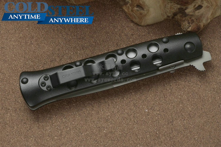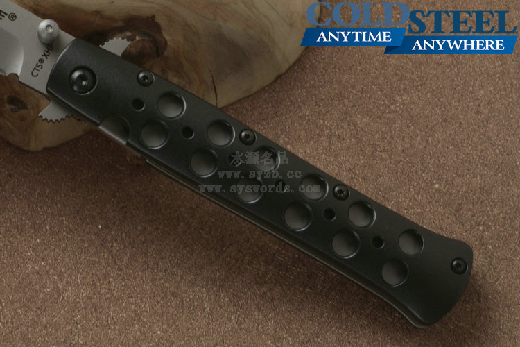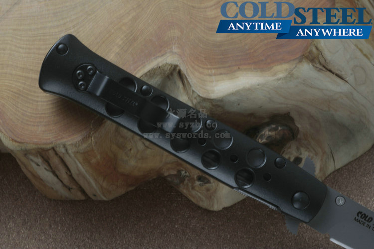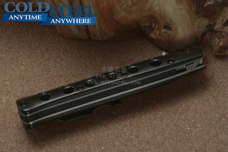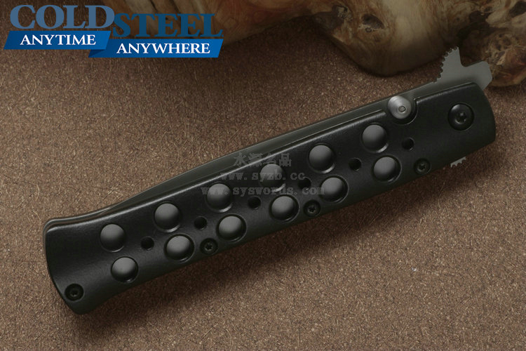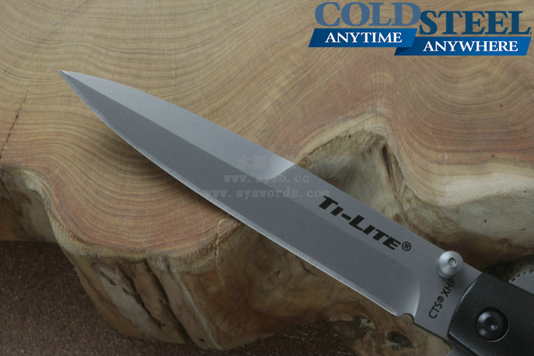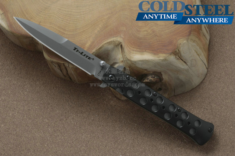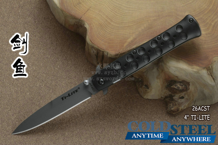类 型: 折刃 型 号: 26ACST 全 长: 22.23cm 刃 长: 10.16cm 闭合长度: 13cm 刃 材: Carpenter CTS® BD1 Alloy 硬 度: 59-60HRC 表 面: 钛涂层 刃 厚: 0.3cm 柄 长: 12.07cm 柄 材: 7075高级铝合金/440A钢0度淬火 锁 型: 线锁 重 量: 130g 产 地: 台湾 冷钢剑鱼Ti-Lite战术折刃是在经典的1950式弹簧折刃的基础上制作而成的。使用 Carpenter CTS® BD1 Alloy不锈钢制成的刃片表面采用珠光喷砂处理,拥有锋利的刃部以及坚固、针尖式的刃尖。手柄由超硬的7075铝合金制成,使用数控车床铣削加工并进行表面喷砂处理,并镀有放电电镀(Electric Discharge Plating,EDP)保护层。为了让刃具更具强度和安全性,这把刃配备了Ti-Lites和不锈钢钢板弹簧锁(在测试中能承受130磅的压力)。独特的齿翼刃鳍让刃具更为灵动,也更加便于使用者掌控刃具。 该系列拥有鲨鱼背鳍式刃鳍开关设计和单侧开刃柱设计,方便使用者尤其是右手使用者进行刃具的开合设计。磨砂面子托手柄为使用者提供出色握感,刃柄两侧开有的镂空孔洞既能够增加刃身的防滑性,又能很好的发挥排汗作用。 为了便于随身携带,Ti-Lites配有不显眼的小型钢制刃夹,并可以通过拇指螺栓单手或挂擦口袋边缘来迅速开刃。 感谢定制刃匠Phil Boguszewski,他的设计对Ti-Lite的创造拥有着决定性的影响。