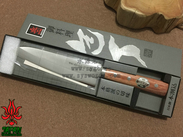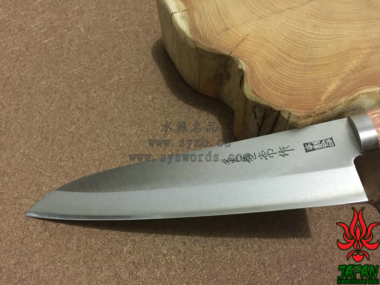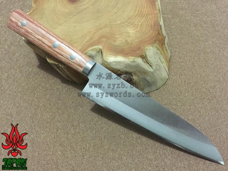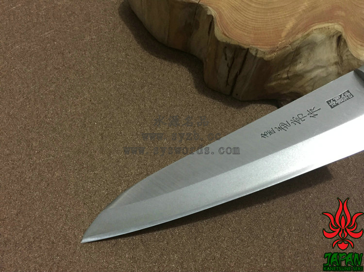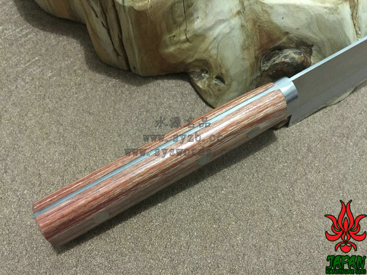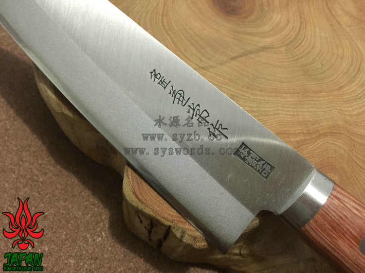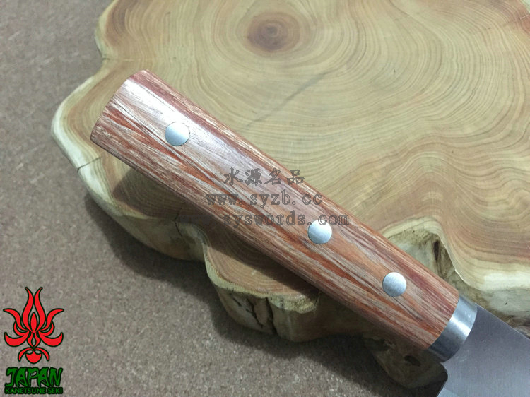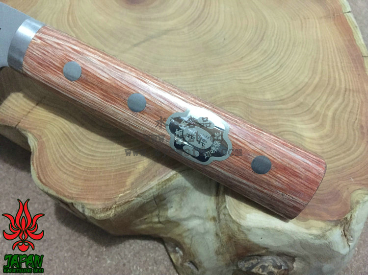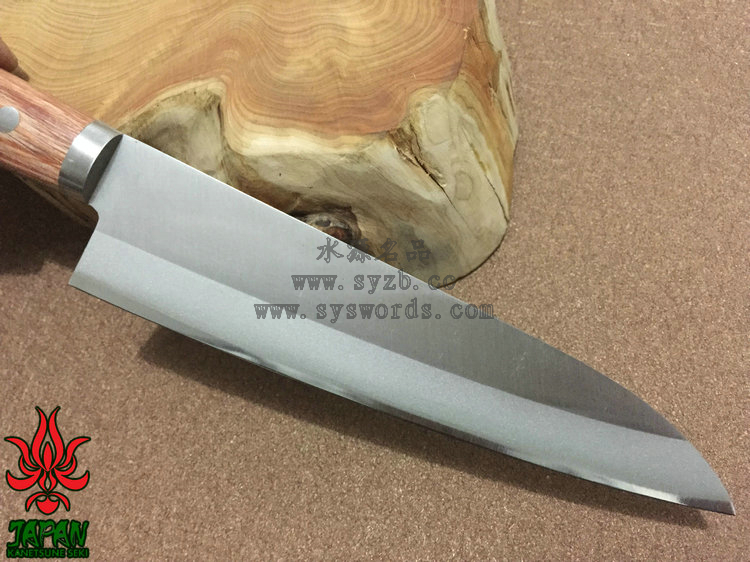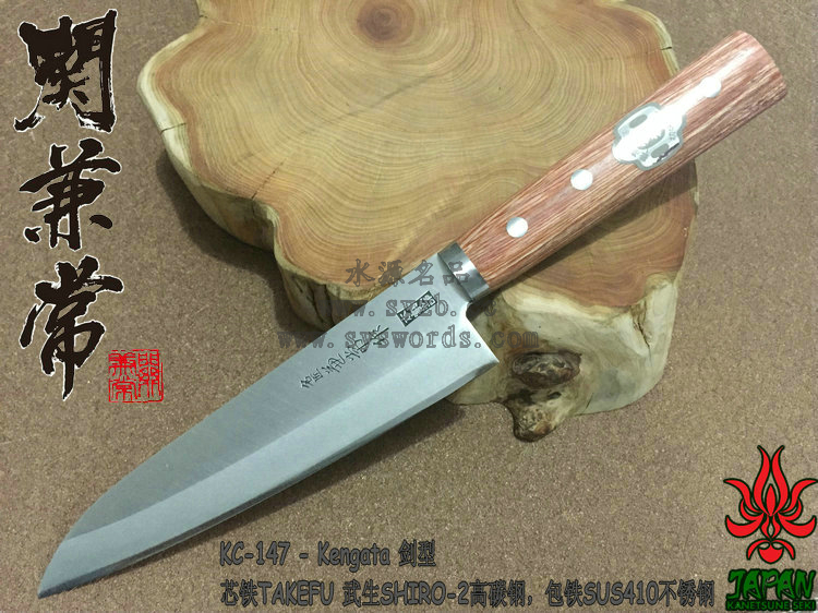 类 型: Kengata剑型 型 号: KC-147全 长: 305mm 刃 长: 180mm刃 材: Takefu Shiro2 High carbon steel / SUS410 Stainless Steel 武生Shiro2高碳钢核心 SUS410夹钢硬 度: 59HRC以上 刃 厚: 1.8mm 柄 长: 125mm 柄 材: 棕色压缩木手柄重 量: 150g 产 地: 日本 为了更好的打开国际市场,关氏推出了一系列拥有日本传统特色的厨刃用具,融合古法技艺和现代工艺而成,并兼具二者之长。这款KC-147使用武生Shiro2高碳钢和SUS410不锈钢锻造,核心的Shiro2高碳钢钢非常锋利,而两侧包夹的SUS410容易打磨且不易生锈。两种钢材的结合处进行双相热处理加工(Dual-Phase treatment),保持刃身强度和其他性能。经过精心研磨后刃具拥有极出色的锋利度和切削能力,并被打磨成符合中国用户使用习惯的厨刃,刃身表面印刻“兼常作”标志。刃具手柄两侧贴附棕色合成木并使用三根不锈钢钉固定,手感细腻出色。请在进行处理食材时使用,并避免进行冷冻食品、骨头等坚硬材料的劈砍处理,使用完毕后进行完全清洗并彻底干燥。关于Shiro2钢:Shiro2是非常出色的切削钢材。钢材中添加了镍和铬材质,让其淬火性能高于碳钢的SK系列。Shiro2适用于较厚板材的淬火,具有优良的韧性,被广泛用于较薄的切削工具:如锋利的刃,锯子,厨房刃具等。退火工艺让钢材球化处理更为容易,淬火和回火工艺让钢材内渗碳体分散的细致和均匀。它有助于提高延展性,防止刃具使用中出现刻痕,并大大增加产品持久的切削能力。此外,钢材中添加的镍和铬导致内部形成显微结构的晶粒,大大增加切削性能,并增加钢材的稳定性能。
