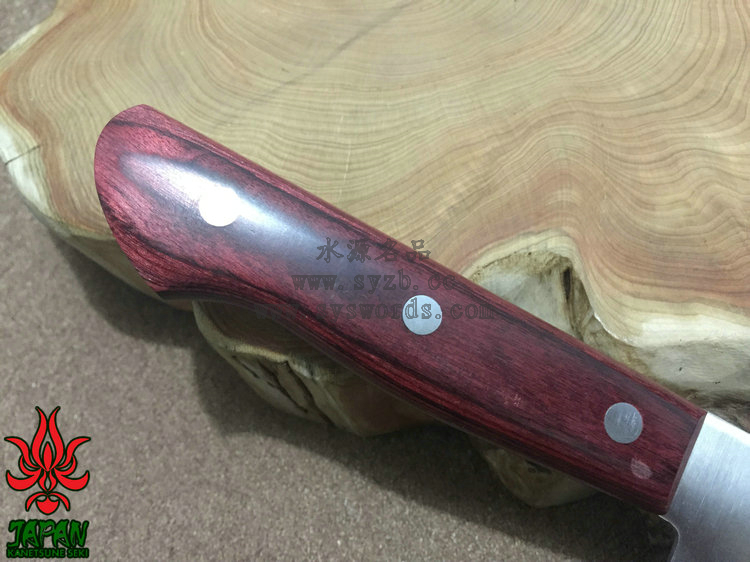 刃具手柄两侧贴附红色合成木并使用三根不锈钢钉固定,手感细腻出色。