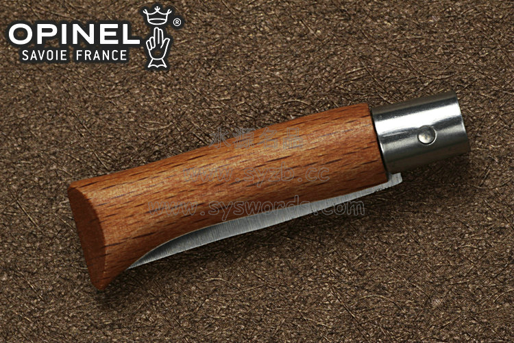 燕尾手柄的形状独特深具个性。经过多年的使用,刃刃可能深深的陷入到木柄的刃槽里面。这时,您只需要将OPINEL木柄尾部在台面轻轻的一磕,隐藏的刃刃就会惯性顺势冲出。