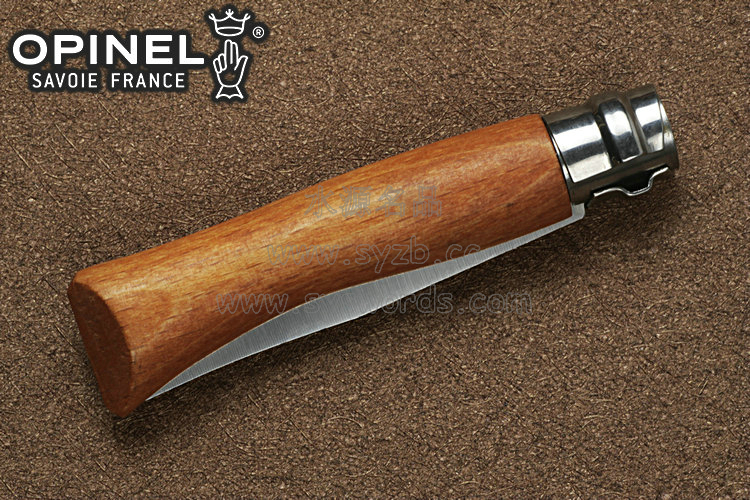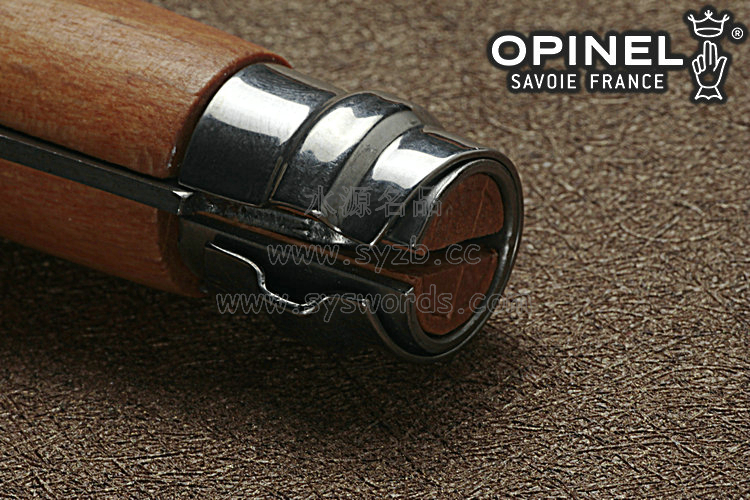 燕尾手柄的形状独特深具个性。经过多年的使用,刃刃可能深深的陷入到木柄的刃槽里面。这时,您只需要将OPINEL木柄尾部在台面轻轻的一磕,隐藏的刃刃就会惯性顺势冲出。