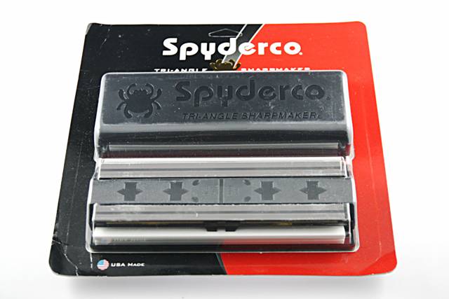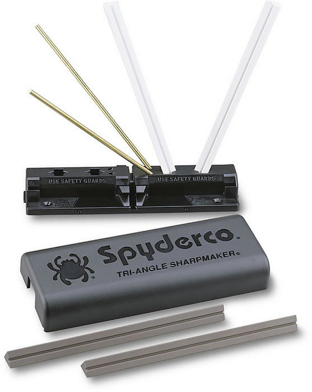 蜘蛛定角磨刃器 配有光盘使用手册!打磨出你锋利的刃具! Chances are you've heard it said "a sharp knife is safer than a dull one". We believe this quote originated from first hand experience and find it to be true. The Sharpmaker was Spyderco's first product, which we made and sold before getting into the knife business. It's true -- First we made things sharp, then we made sharp things. The Tri-Angle Sharpmaker (204MF) includes two sets of high alumina ceramic stones: A pair of medium-grit (brown) stones for aggressive sharpening and a set of fine (white) stones for professional grade finishing. The stones are triangular for sharpening Plainedges on the flat sides and SpyderEdges (serrations) on the corners. A furrow running the length of each stone lets you sharpen pointed items like fishhooks, darts and awls. Included is a set of brass safety rods protecting the users hands while sharpening. All components snap into the self-contained ABS plastic base and lid -- ready to travel with you. Die-cut into the base are keyed slots and holes fitted for the stones. They accurately set the stone's sharpening angle at a 30° (15° each side) or 40° (20° each side) for knives and a 12.5° scissor setting. Turn the base over, a channel lets you lay two stones side-by-side (flat-side up) for use as a benchstone. The lid snaps halfway over the base creating a handhold for stability while you're sharpening. Included is a set of brass safety rods to protect the users hands while sharpening. Ceramic stones, like glass, will break if dropped -- handle carefully. Use them dry, without oil, water or lubricants. To clean: scrub stones with a plastic scouring pad and powered abrasive cleaner, let air-dry. Also autoclave safe. System comes with instruction book and DVD.