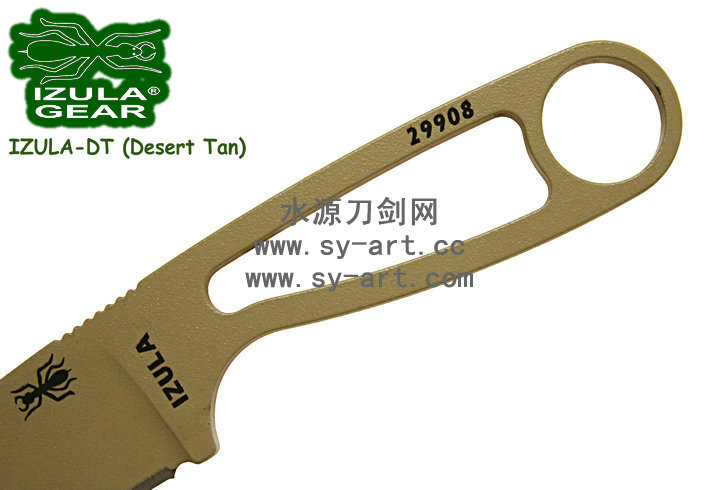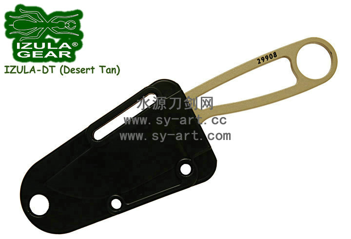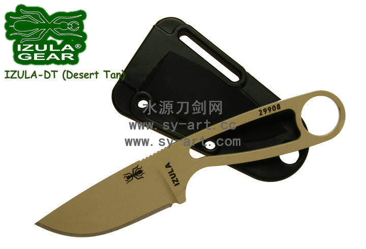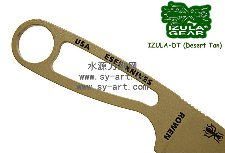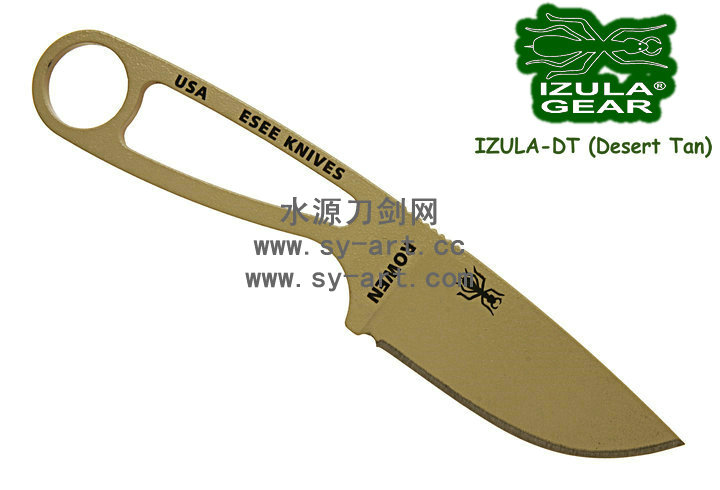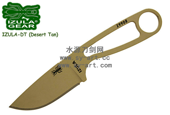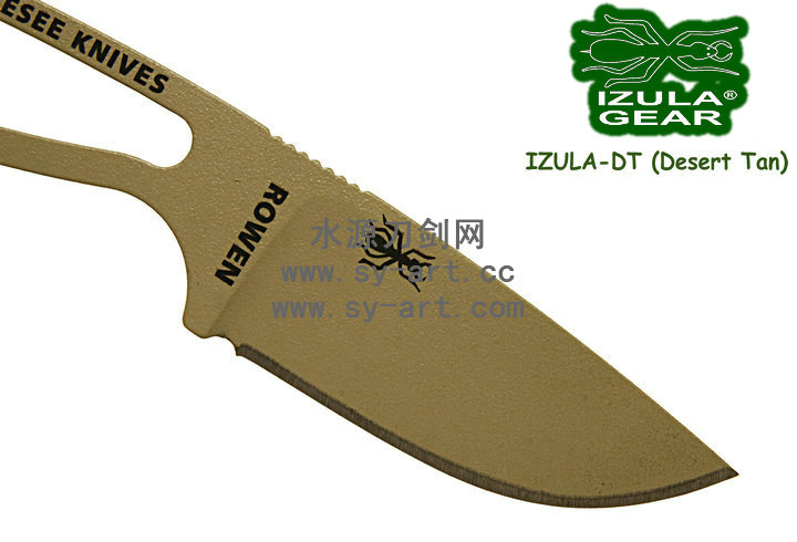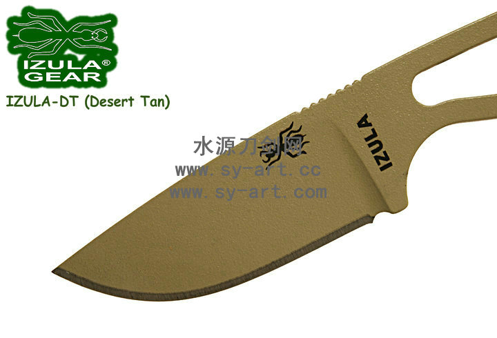 类 型: 直刃 型 号: IZULA-DT (Desert Tan) 全 长: 160mm 刃 长: 68mm 刃 材: 1095 硬 度: 57HRC 表 面: 沙色涂层 刃 厚: 4.1mm 柄 长: 92mm 重 量: 77g(含鞘) 刃 套: 尼龙 产 地: 美国 此款直刃系著名丛林生存刃具RAT公司(Randall's Adventure & Training) 生产,Izula 直刃是为了在严苛的环境下使用而研发制成,坚固耐用,刃刃使用高硬度1095工具钢,刃刃表面防锈、消光处理,刃刃硬度57 HRC,非常适合野外使用。 RAT公司生产的刃具在北美与大名鼎鼎的战术刃具生产者克利斯里夫及T.O.P(尖端战术)公司齐名,其生产的刃具的设计及做工几乎可以和克利斯里夫媲美。