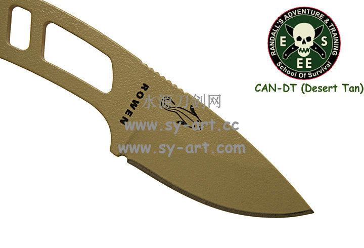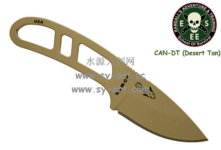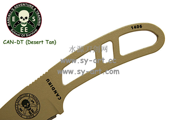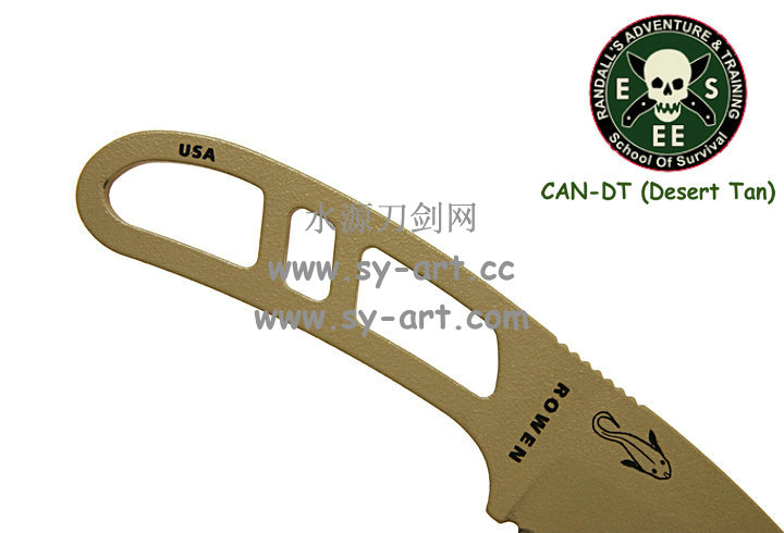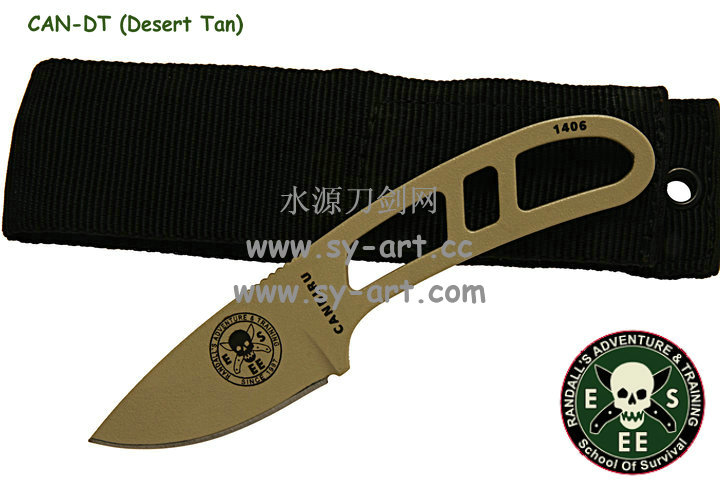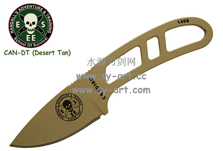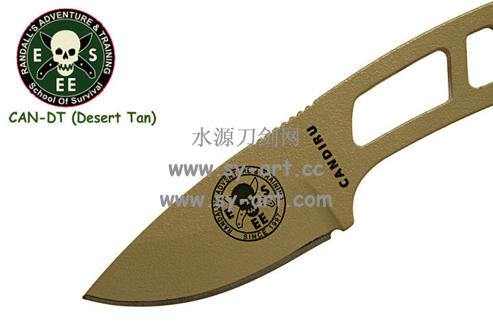 类 型: 直刃 型 号: CAN-DT (Desert Tan) 全 长: 130mm 刃 长: 50.8mm 刃 材: 1095 硬 度:55- 57HRC 表 面: 沙色涂层 刃 厚: 3.2mm 柄 长: 109.2mm 重 量: 48g(不含鞘) 刃 套: 尼龙 产 地: 美国 “candiru”牙签鱼绰号是“巴西吸血鬼鱼”。是一种属于鲶鱼类的淡水鱼。这种鱼体型很小,身体细长,通常寄生在亚马逊河的大型鱼类的腮部。它们身形似鳗鱼而且全身几乎透明,令到它们非常难以被看到。这种鱼有着平滑而带有黏液的表皮,鱼鳃带有倒勾状的刺,是强力而快速的游泳选手。 此款生存小刃正如他的名字一样,虽然小巧,但是具备了在野外生存时所需要的功能,同时拥有强壮的体魄及强有力的杀伤力。