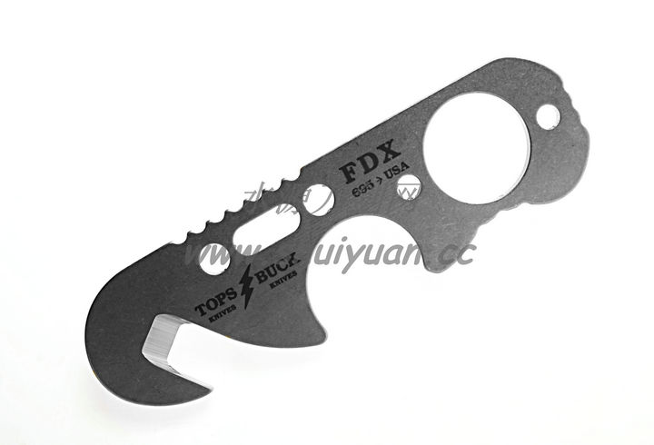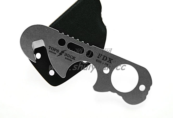 类 型: 直刃 型 号: 0695SSGTP-B 全 长: 115mm 刃 材: 420HC 硬 度: 58HRC 表 面: 石洗 刃 厚: 4mm 鞘: K鞘 重 量: 68.3g 原产地: 美国 When a military operator is in the field, they need heavy-duty, reliable tools that offer quick access and the utmost reliability. The heavy-duty TOPS/Buck FDX (Field Duty Xtreme) Cutter is a rapid and reliable tool with a supreme cutting edge of the best quality materials. The large handle grip easily allows for use by gloved hands and the rescue hook can be used with any situation, even as an oxygen bottle wrench. The FDX is secured in a Kydex carry sheath, making it safe and very portable.