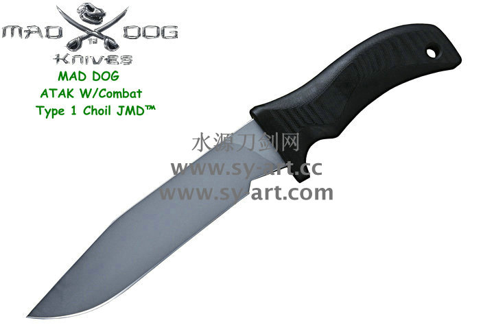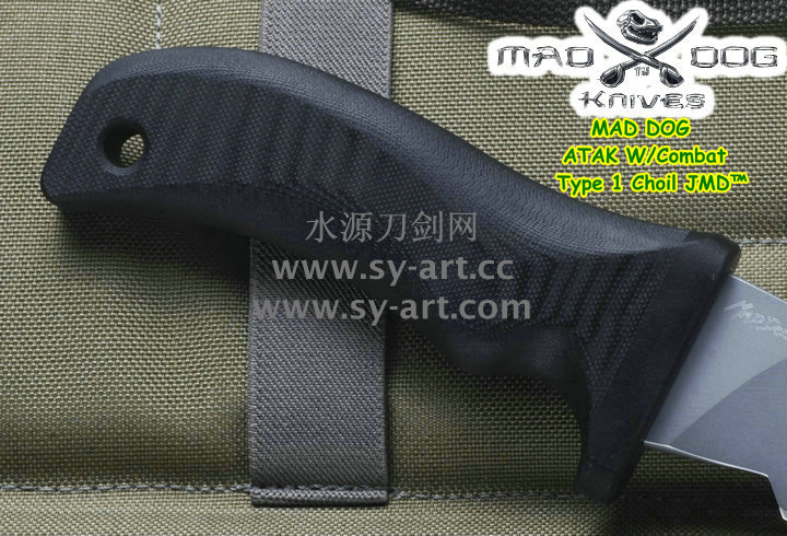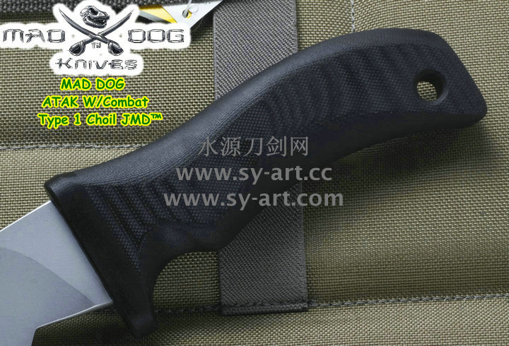 它的手柄符合人体工程学设计,把握极其舒适称手。食指凹槽让使用者即使看不见也能凭手感找到握刃的位置。材料使用特殊的玻璃纤维与环氧基树脂合成来做刃的握柄。此种特殊材质每一平方英寸可承受79000磅的压力(约3600公斤),可以轻易地承受0.45口径子弹的冲击。因此Mad Dog刃的握柄就算很严苛的使用也不会造成损害。此种握柄材质同时也提供了极好的绝缘,每0.001吋可承受1000伏特的电压,因而可以保护持刃者不会在使用刃具时遭受电击。另外这种握柄材质也几乎不受化学物质的渗透及侵蚀。