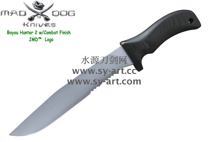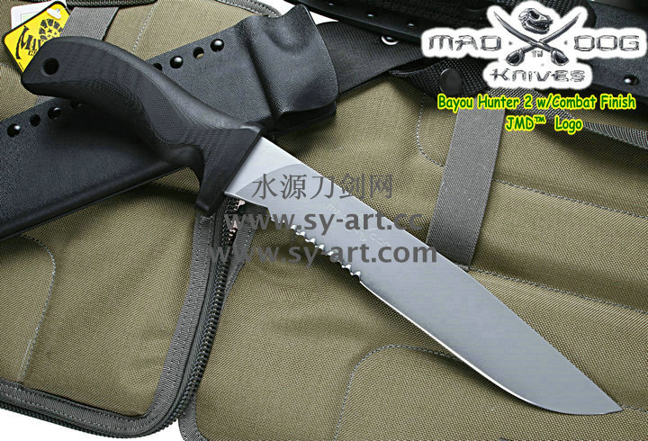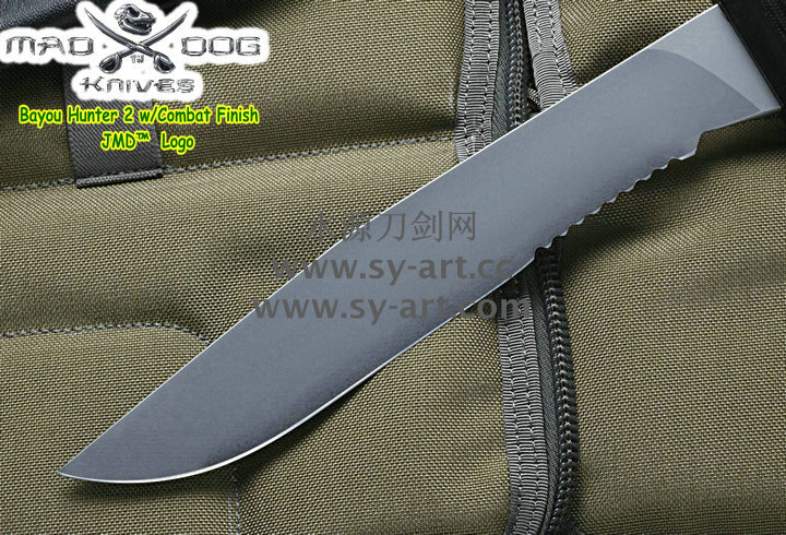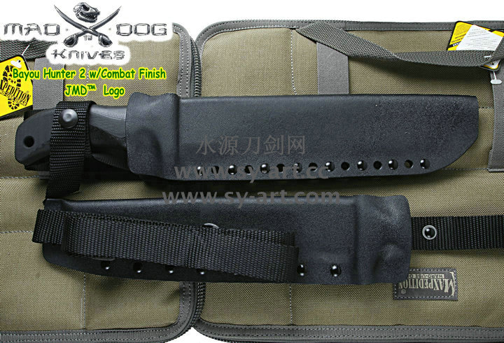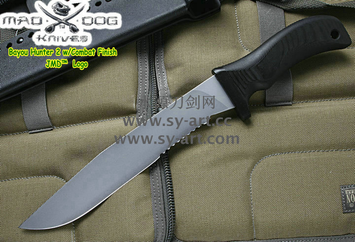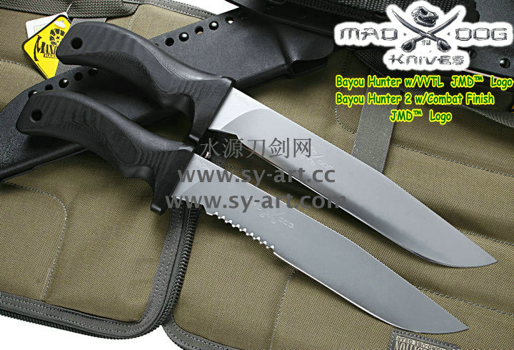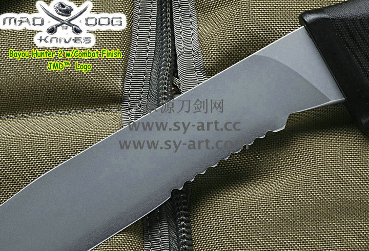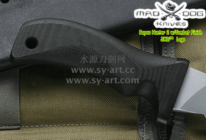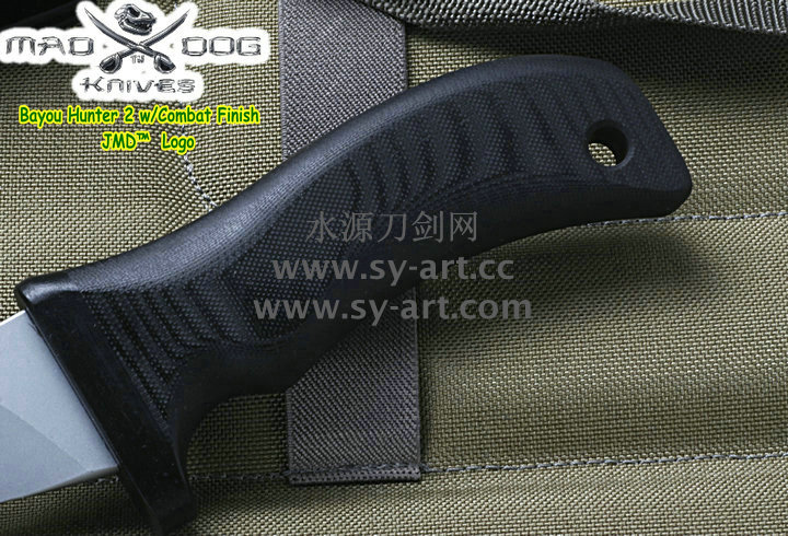 Mad Dog刃具的手柄都经过人体功能学设计,形状独特,把握极其舒适称手。它的食指凹槽让使用者即使看不见也能凭手感找到握刃的位置。手柄材料是一种不公开的黑色环氧玻璃,可承受极高压力和高温,这种材料可以轻易地承受 .45口径枪子弹的冲击,而且几乎不被化学溶剂腐蚀。全隐藏式柄芯,确保使用者在工作时不会触电。
