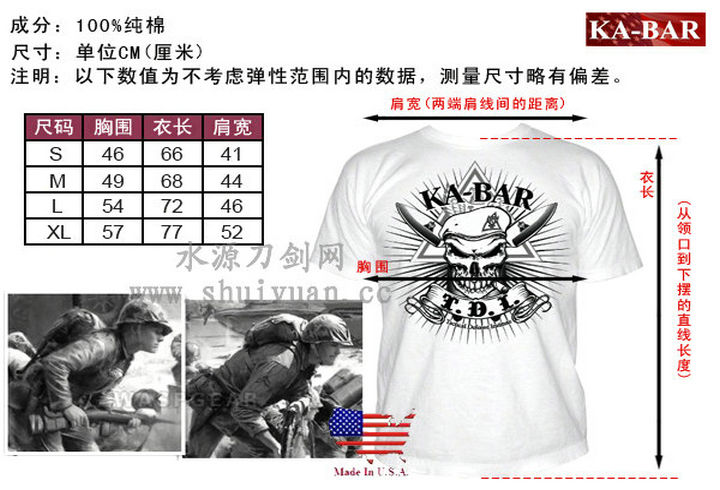 Kabar厂家推出的战术T恤是以经典的畅销刃型为蓝本由著名的刃具设计师、艺术家、卡巴厂家人员、服装设计师等组成的强大制作团队完成,此款系列T恤设计时尚简约,衣身有流畅的通体印花设计让衣服整体很有立体感觉。衣服领部采用罗纹制作工艺精湛,弹性好耐久度高不变形C弧蒸压定型技术保证T恤领口不变形,衣服底边均使用进口双线机车工艺制作,细密针脚彰显品质。