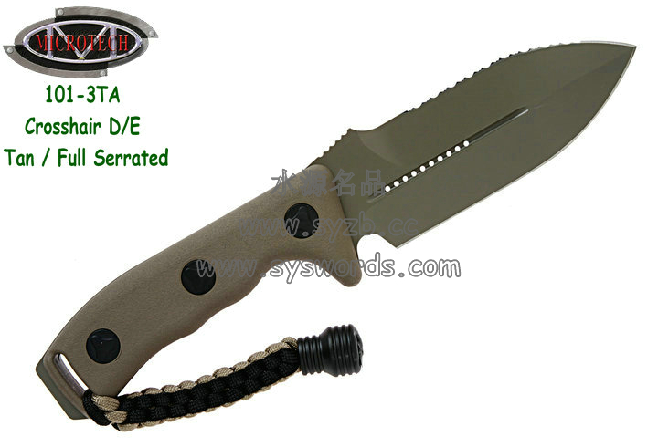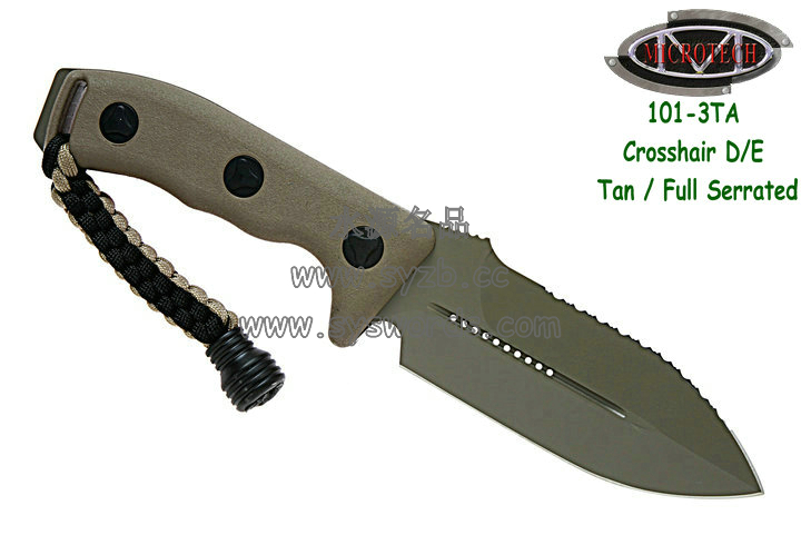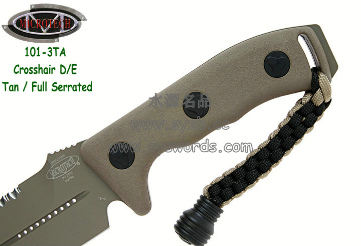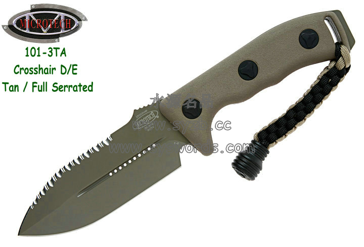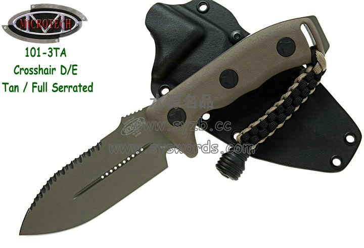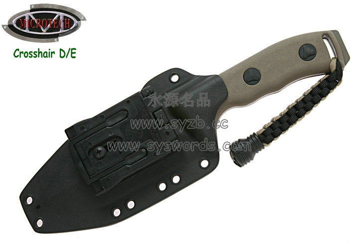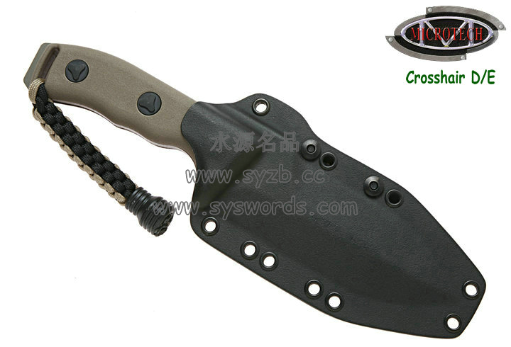 The Microtech Crosshair fixed blade knife is tried and true; this knife will hold up to the most adverse conditions. The D2 tool steel blade is full tang, black finished and double edged. The both edges are partially serrated. The handle has black composite scales and a braided lanyard with a stainless steel "knocker" bead. Includes a heavy duty black Kydex Bladetech sheath.