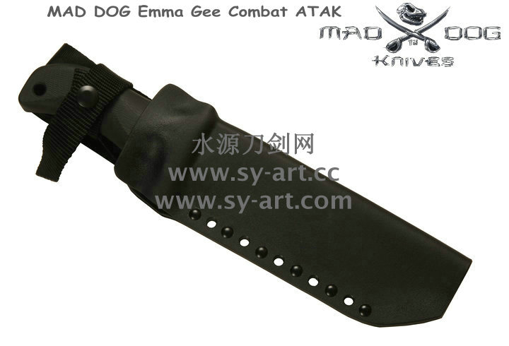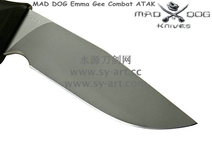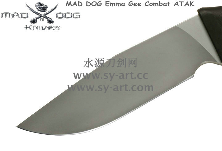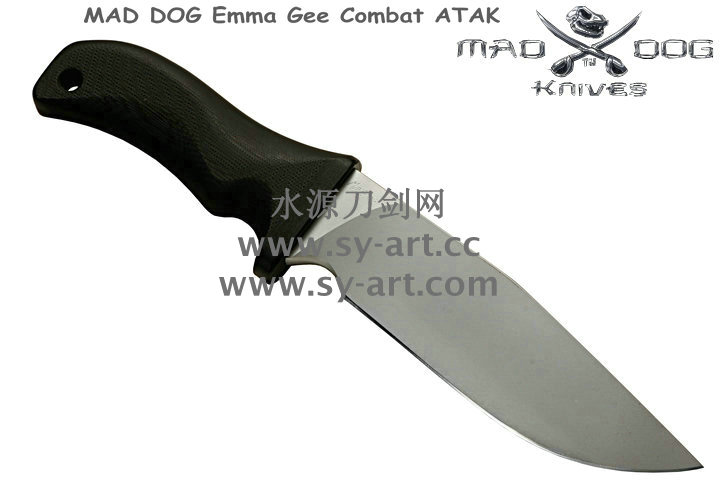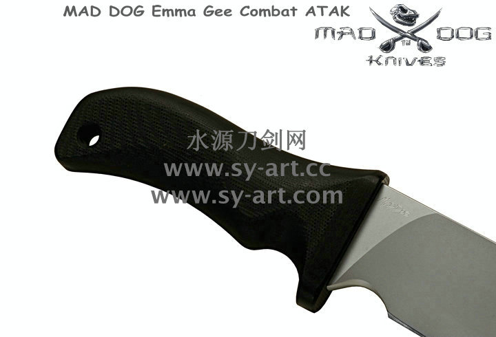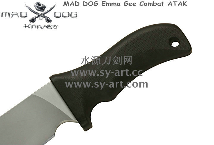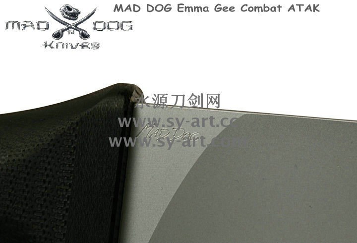 Mad Dog刃具的手柄都经过人体功能学设计,形状独特,把握极其舒适称手。它的食指凹槽让使用者即使看不见也能凭手感找到握刃的位置。手柄材料是一种不公开的黑色环氧玻璃,可承受极高压力和高温,这种材料可以轻易地承受 .45口径枪子弹的冲击,而且几乎不被化学溶剂腐蚀。全隐藏式柄芯,确保使用者在工作时不会触电。