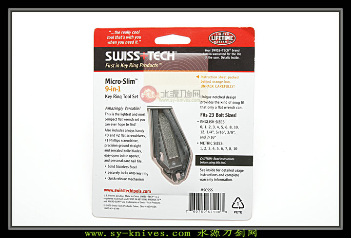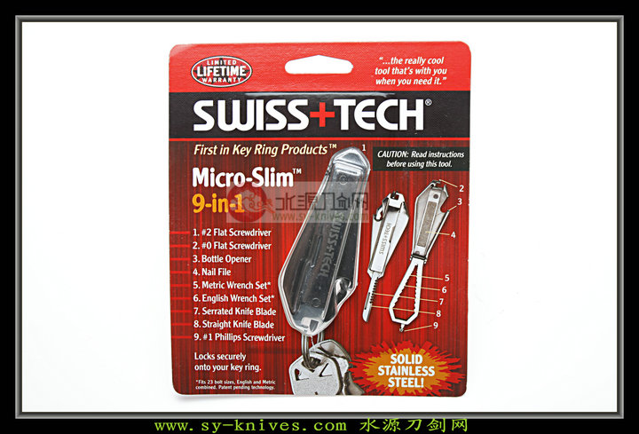 瑞士科技公司是赖恩先生在美国的俄亥俄州建立,从1994年公司成立至今发明了多项专利、设计了许多原创,都深受消费者喜爱。大多数产品都与钥匙链结合的多用mini工具,科学、实用、方便。15年的时间里,全球有深受着超过3000万的驾驶者的钟爱! 9合1便携工具扳手,是瑞士科技公司于2010年推出的新款便携折叠工具,集合9种日常工具为一身。同时拥有迷你的尺寸与多款便携功能,在同系列便携工具中独一无二。 工具采用高级不锈钢材质可以承受较大的强度也可以永不生锈彰显档次,产品以英制,公制扳手为主配合大小一字螺丝刃,一个十字螺丝刃,方便的平刃 锯齿小刃,指甲锉。轻松应对日常事物,无论是松紧螺丝、仪表清理、开启饮料,都可以轻松解决。产品重量轻盈可折叠非常容易携带,还配有快速分离挂环同样可以悬挂在钥匙上。 产品尺寸 长:79.3mm(闭合尺寸) 宽:28.5mm 厚:95mm 钢材:4650不锈钢 重量:62g 功能: 1大一字螺丝刃 2小一字螺丝刃 3饮料开瓶器 4指甲锉 5英制扳手 6公制扳手 7平刃小刃 8锯齿小刃 9十字螺丝刃
