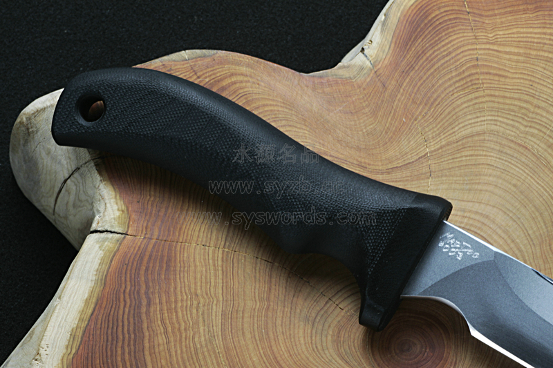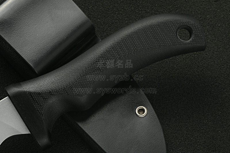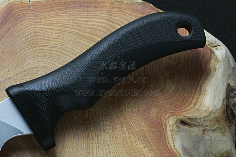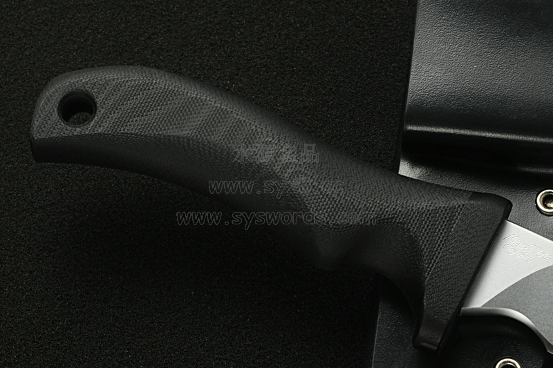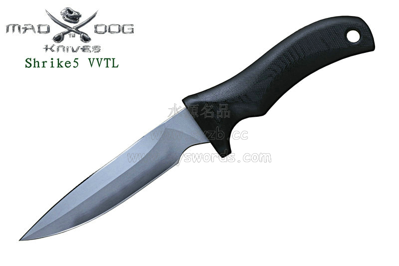 它的手柄符合人体工程学设计,把握极其舒适称手。食指凹槽让使用者即使看不见也能凭手感找到握刃的位置。材料使用特殊的玻璃纤维与环氧基树脂合成来做刃的握柄。此种特殊材质每一平方英寸可承受79000磅的压力(约3600公斤),可以轻易地承受0.45口径子弹的冲击。因此Mad Dog刃的握柄就算很严苛的使用也不会造成损害。此种握柄材质同时也提供了极好的绝缘,每0.001吋可承受1000伏特的电压,因而可以保护持刃者不会在使用刃具时遭受电击。另外这种握柄材质也几乎不受化学物质的渗透及侵蚀。