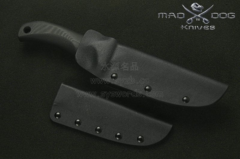 所有Mad Dog刃子及刃鞘系统都是以手工制作而成。Mad Dog钢材刃都是使用一种叫Starrett 496-O1的高碳工具钢,最独特的是它的热处理方式,先经过硬化(Hardened)然后再选择性回火(selectively tempered)而成。每个部分的热处理都不一样,刃锋部分的硬度是63-67HRC,在刃背部分则是50-55HRC,刃尖部分是59-61HRC,手柄部分48-52HRC,整刃分为4个部分处理,这种科学的方法成为分段热处理。这种方法可以使刃具既有很高的硬度又有较强的韧性,劈砍,穿刺,切割,撬砸等,能适应各种高强度工作。