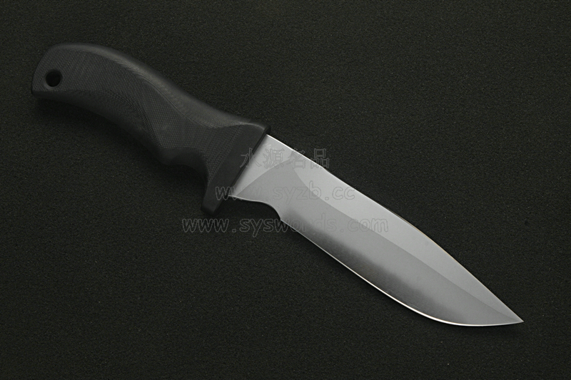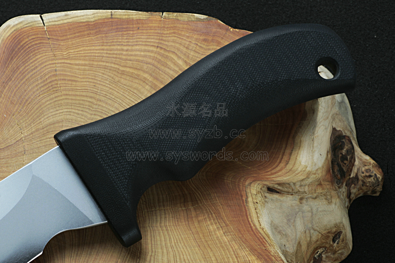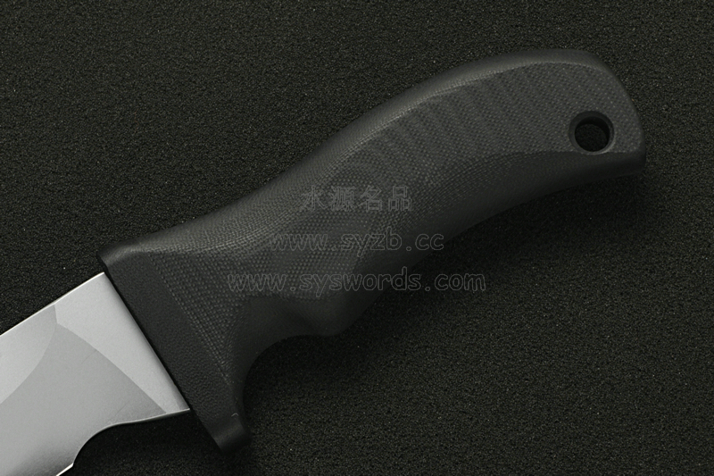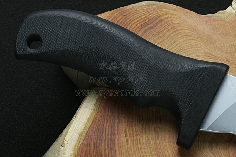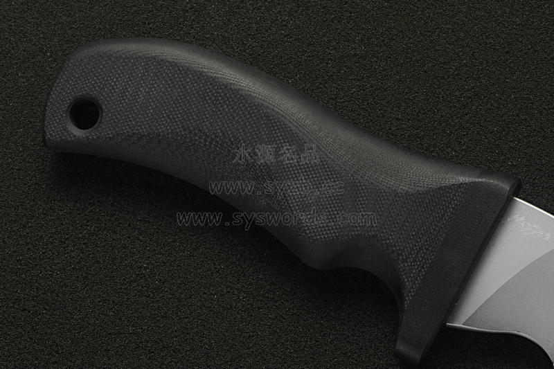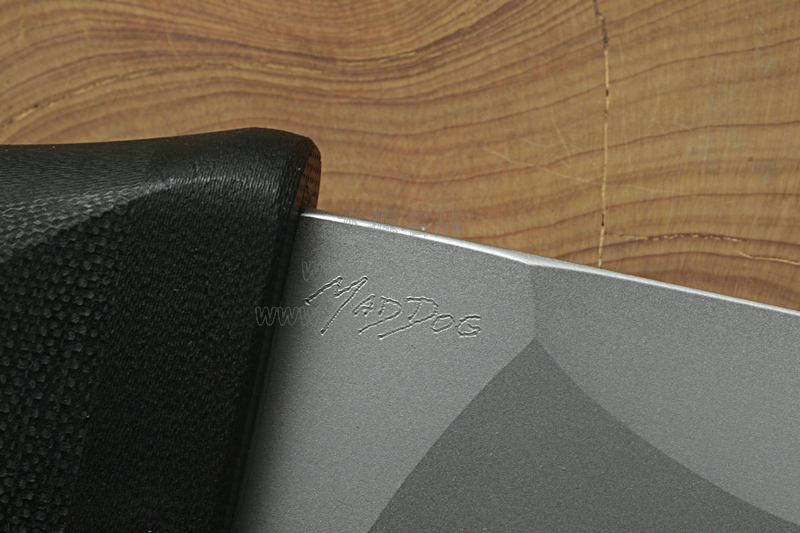 它的手柄符合人体工程学设计,把握极其舒适称手。食指凹槽让使用者即使看不见也能凭手感找到握刃的位置。材料使用特殊的玻璃纤维与环氧基树脂合成来做刃的握柄。此种特殊材质每一平方英寸可承受79000磅的压力(约3600公斤),可以轻易地承受0.45口径子弹的冲击。因此Mad Dog刃的握柄就算很严苛的使用也不会造成损害。此种握柄材质同时也提供了极好的绝缘,每0.001吋可承受1000伏特的电压,因而可以保护持刃者不会在使用刃具时遭受电击。另外这种握柄材质也几乎不受化学物质的渗透及侵蚀。
