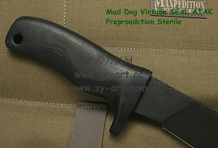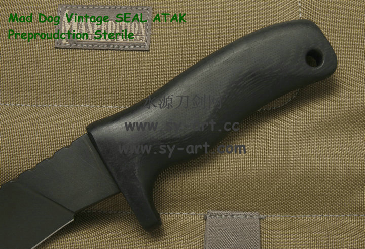 它的手柄符合人体工程学设计,把握极其舒适称手。食指凹槽让使用者即使看不见也能凭手感找到握刃的位置。材料使用特殊的玻璃纤维与环氧基树脂合成来做刃的握柄。此种特殊材质每一平方英寸可承受79000磅的压力(约3600公斤),可以轻易地承受0.45口径子弹的冲击。因此Mad Dog刃的握柄就算很严苛的使用也不会造成损害。此种握柄材质同时也提供了极好的绝缘,每0.001吋可承受1000伏特的电压,因而可以保护持刃者不会在使用刃具时遭受电击。另外这种握柄材质也几乎不受化学物质的渗透及侵蚀。