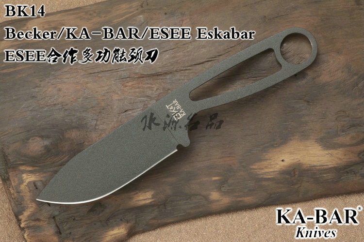 类 型: 直刃 型 号: BK14 全 长: 177.8mm 刃 长: 82.55mm 刃 材: 1095 Cro-Van 硬 度: 56-58HRC 刃 厚: 4.2mm 表 面: 非反光黑色环氧涂层 开刃角度: 20度 柄 材: 1095 Cro-Van 重 量: 68g 原产地: 刃在美国生产 套在台湾生产 历史悠久之刃厂,着名於军刃、刺刃、格斗刃等,美国海军陆战队在韩战、越战时采用之军刃。KA BAR Knives, Inc 总公司Alcas Corporation是国际名刃具工厂,世界知名出品有U.S.M.C.战术刃、打猎刃、鱼刃、收藏刃等… KA BAR 刃厂总部成立于美国纽约,曾於1998年庆祝其公司成立100周年。 Ka-bar刃厂以前叫做Union Razor Co.,被称为Ka-bar 是由于一位猎人的推荐信函。这位猎人在打猎的途中遇到了熊,子弹用尽的他只好拿起了他那由Union Razor Co.所造的高品质猎刃来与熊搏斗,因而保住了性命,他在信上写到这把刃可以杀熊(Kill a bear ),但是因为这位猎人的教育层度不高,将它写成Kil a bar,后来又被人们缩写成Ka-bar,因此Ka-bar这个名字便被大家所传颂,甚至比Union更有名气,因此在1951年时,Union Razor公司正式改名为Ka-bar ,但在此之前Union公司便已在他们生产的刃上打上Ka-bar的标志。 自1942年二次大战爆发不久,KA BAR刃厂提交首批軍刃與U.S.M.C. (美国海军陆战队) 队员使用。军方于3年后,公元1945年确认其军刃之可靠性能,而把该刃命名为U.S.M.C. Fighting / Utility Knife "美国海军陆战格斗及多用途刃",而其它武装部队也开始被建议采用此刃。 KABAR生产了共超过一百万把军刃,曾在供不应求之情况下,KABAR刃厂直接受权予其他生产商生产其他类型之军刃给各军队使用,及在刃上印上其他生产商之名称,但出厂的每一把刃也被认为名符其实是KABAR军刃 ! 是因为基於它的质量和耐用性,获很多使用者对此刃之信赖,作为日常工作之用 -- 例如修理装置、挖狐洞、磨利帐蓬支柱、开罐头和最重要是在战乱时代作为一种防身利器。KABAR 军刃的知名度於二次大战後大大提高,其後於韩,越战,沙漠风暴等战争中也被积极采用。 KA-BAR以生产直柄刃闻名于世。美国KA-BAR卡巴公司少量新刃型号在公司台湾基地生产,但基本所有产品都在美国基地生产。美国KA-BAR刃具公司产品全部从美国进口。军警人员采用。 1800年代末期,纽约西部及宾州北部地区。当时有超过30家以上刃厂的规模。但随着不断地淘汰及经济上的冲击,目前只硕果仅存了少部份质优的厂商。而KA-BAR刃具公司就是其中之一。直到1996年经过纽约州奥林市的阿卡斯公司机(Alcas Corporation)重整。KA-BAR刃厂现在在产品的制作、研发、创新及客服上都更广得回响,产品优越品质为大众所认同。以阿卡斯角族的决心魄力,KA-BAR刃厂必能更上一层楼。