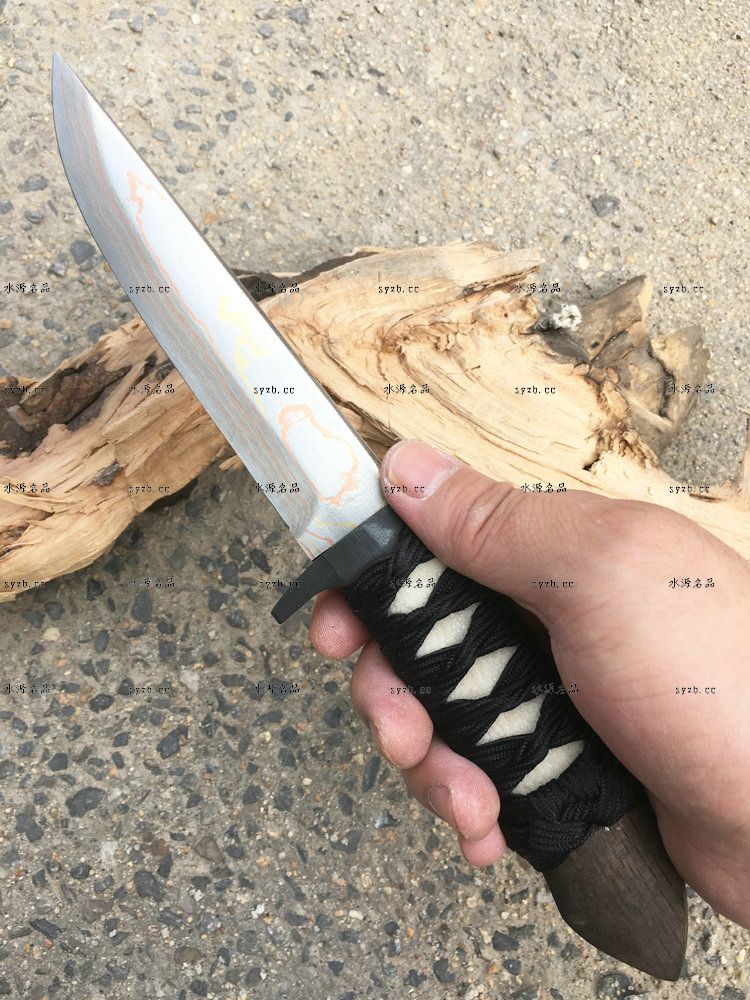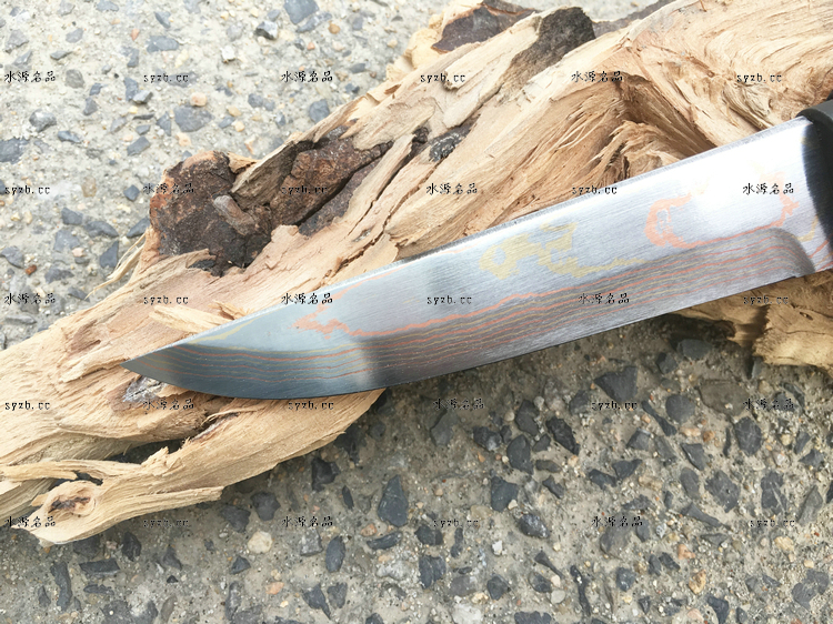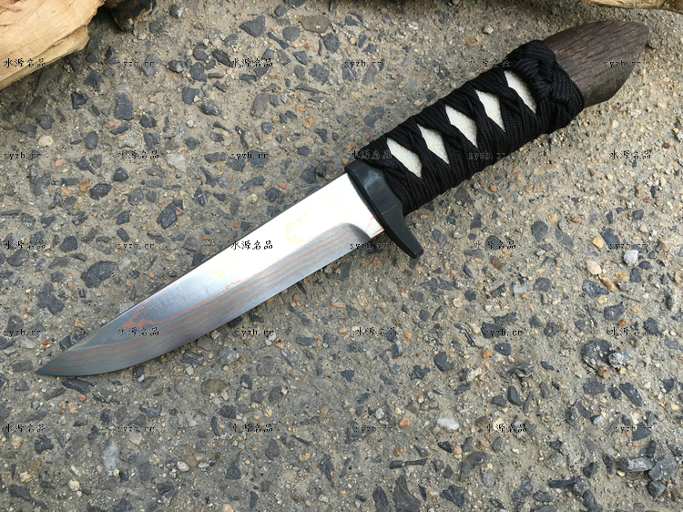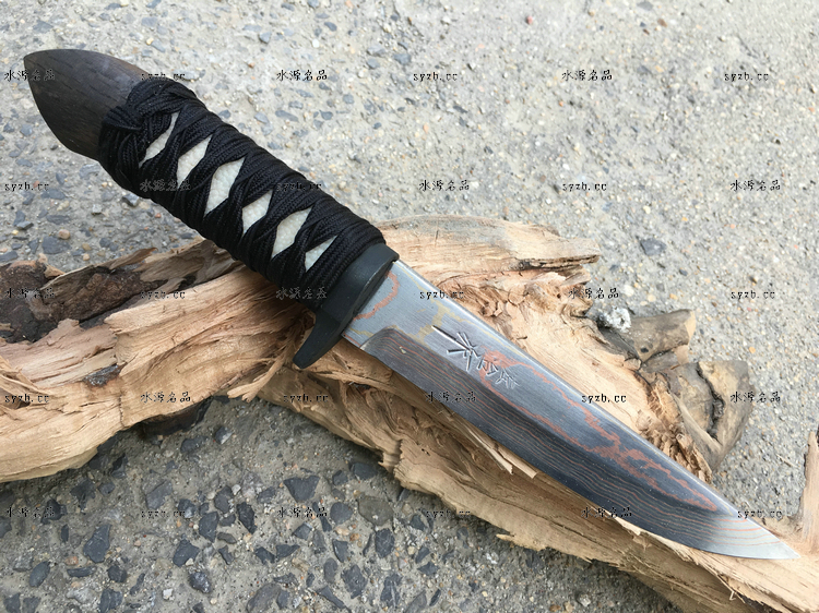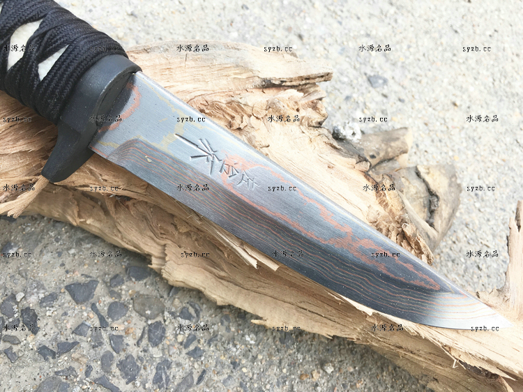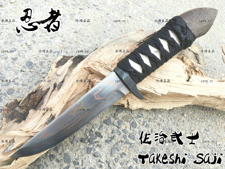 型 号: 忍者 全 长:255mm 刃 长: 132.5mm 刃 材:彩色多层大马士革 硬 度: 60HRC 刃 厚: 4.5mm 刃 宽: 27mm 原产地: 日本 柄 材: 实木+白色鱼皮+黑色绳 这款佐治武士猎刃作品刃身采用以彩色多层大马士革钢制作,刃身带有明显日式风格,锋利的刃头设计利于穿刺和近身格斗。极幼开锋(蛤刃)打磨无论是切削或是劈砍都非常合适。是一款进行战术和狩猎使用的出色产品。刃身一侧刻有“佐治作”标志。
