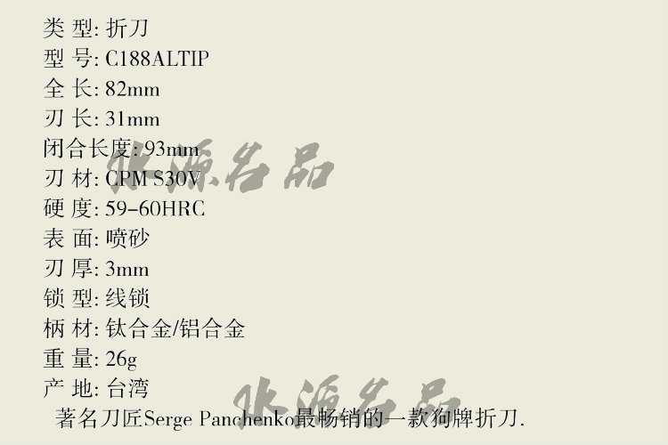 Serge Panchenko出生在乌克兰,八岁时与他家人移民到美国。带着工匠的天分与热情,他开始制作他的系列小dao,并在2007年开始首秀。 Panchenko制作各种类型和风格的定制dao具,力争完美地平衡每一个产品的艺术感染力和实用功能。除了手工制作、约定时间定制dao具,他还制作手工灯笼、小珠宝和其他物品,以及“mid-tech”dao设计,结合部分完成,定制加工的零件,他对细节的关注是用手工完成的。他的一个最热门的mid-tech设计是身份牌(狗牌)折叠小dao,一个小的令人惊讶的折叠dao,关闭时就像一个身份牌。由于Spyderco专注于独特的功能紧凑型dao具,身份牌(狗牌)折叠小dao成为Panchenko协同努力的代表产品。 身份牌(狗牌)折叠小dao是Spyderco典型折叠dao里边的奇特品种。本款手柄由钛制成,准确地再现了美X军身份牌的尺寸和形状。手柄中心被加工以容纳钢球轴承。在手柄的顶部是限定块,在打开和关闭位置行进dao片限制,当dao合拢时从边缘提供保护。 身份牌的“business end”是一个羊脚式dao片,使用优质CPM?S30V?粉末不锈钢制成。在关闭时为了保护锋口,一个不寻常的特征为dao片前侧是单一的平斜面。使用蜘蛛dao的商标圆孔?dao片可以轻松开启,和一个微妙的swedge(不锋利的伞)和装饰更全面(槽)附近的脊椎增添一抹风情。dao片的枢轴也由一个圆形钛盘制成,它提供稳定性和结构强度,以及一种完美的触摸感。 折叠后是非锁定的,身份牌(狗牌)折叠小dao需要在棘爪机构打开后保持在适当位置。滚珠轴承的手柄、弹簧臂、持有手指孔保证关闭和打开。由于dao片不锁,在使用过程中应注意,只有在dao片完全展开后,才能带压力切割。 身份牌(狗牌)折叠小dao是一个非常新颖的切割工具,重新定义日常携带dao的概念。我们相信,这将很好地服务与你。
