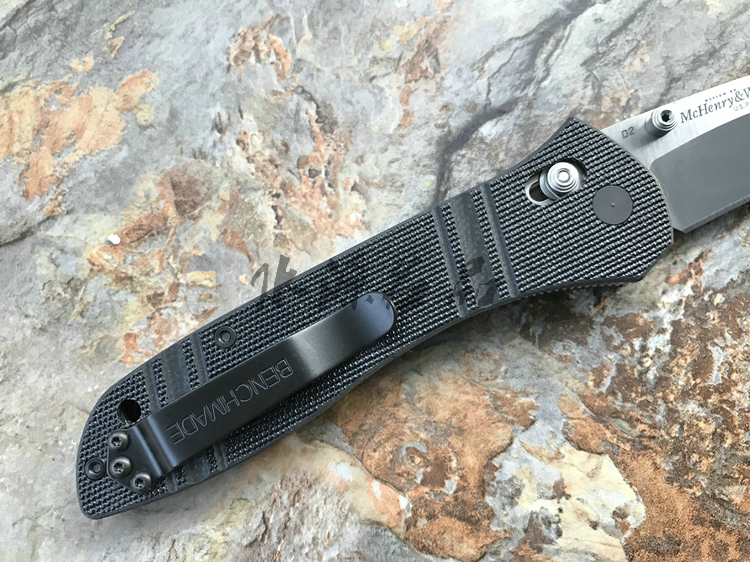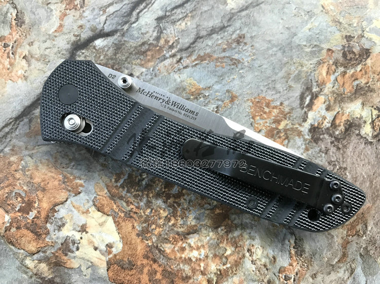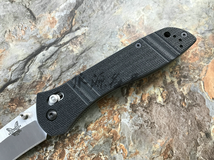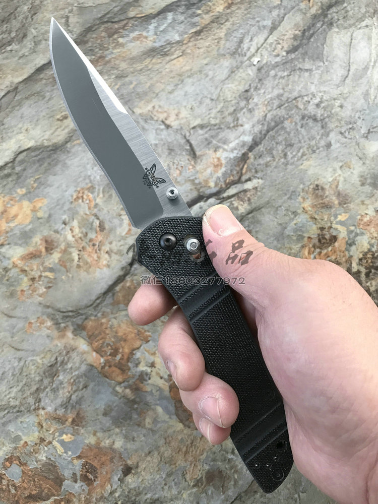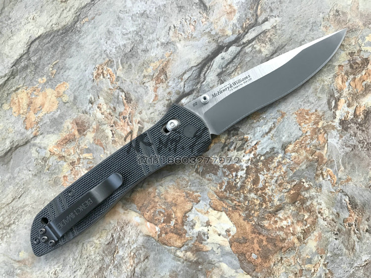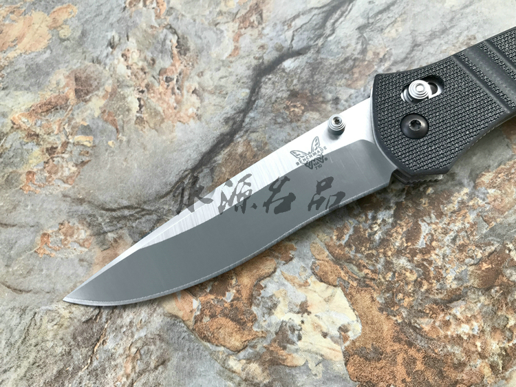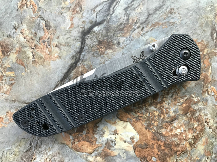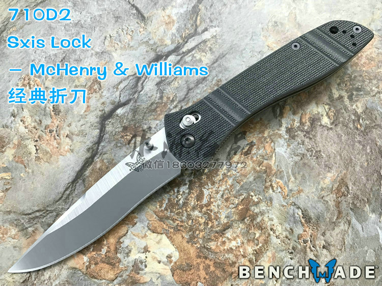 类 型: 折刃 轴锁 型 号: BM710 D2 全 长: 223.52 mm 刃 长: 99.06 mm 硬 度: 59-61HRC 刃 材: D2工具钢 表 面: 缎面 刃 厚: 3.048mm 柄 长: 124.46mm 重 量: 127.57g 柄 材: G10 原产地: 美国 BM 710 D2是一把非常出色的Axis 锁折刃 。这种看似非常简单的锁型由Bill McHenry与 Jason Williams发明,是二人四年多不懈努力的成果,其优点是非常强壮,在测试时,它能够承受200磅反向负重;同时非常安全,因为在开/关刃时,使用者的手指不会经过刃锋轨道;同时它使折刃能快速打开和关上。 杰出的定制刃匠组合 Bill McHenry与 Jason Williams创造的 BM710堪称折刃中的经典,它们带动了 AXIS 锁的革命。修长流畅的线条设计与 AXIS 锁相结合,使它成为一把有效和优美的刃具作品。 略略内凹的刃刃的打磨曲线很好地提高了切割能力;双面拇指螺栓令打开刃刃更方便。经过人体功能学设计的手柄由G-10柄面夹双层经过热处理的 410不锈钢构成,极其坚固耐用。另外,手柄前端垫片上的指槽提供更好的刃刃控制度和把握稳定性。