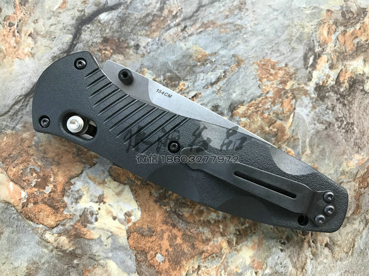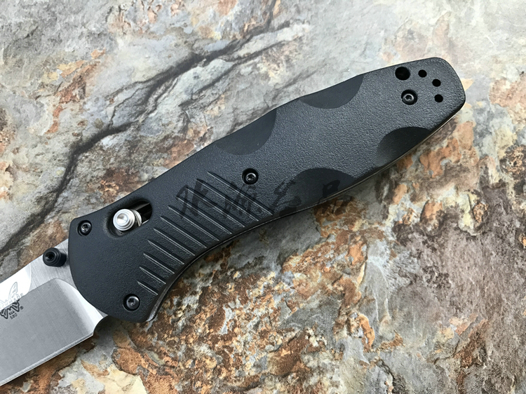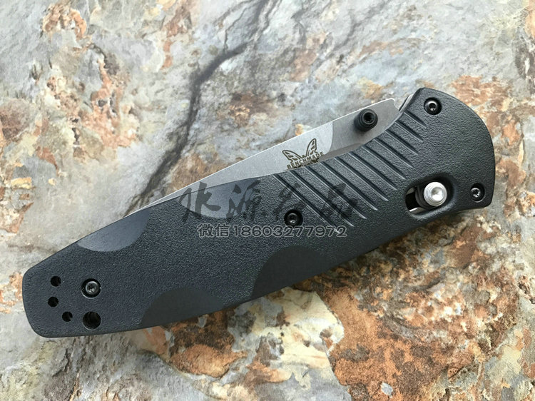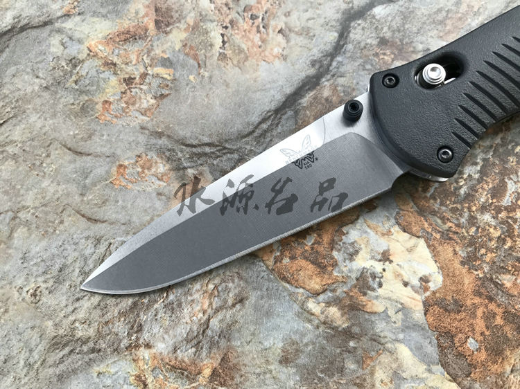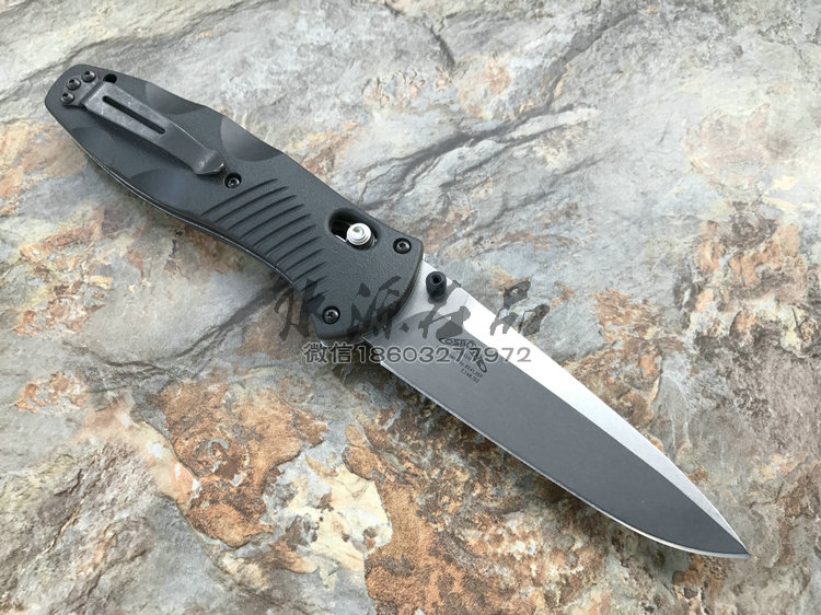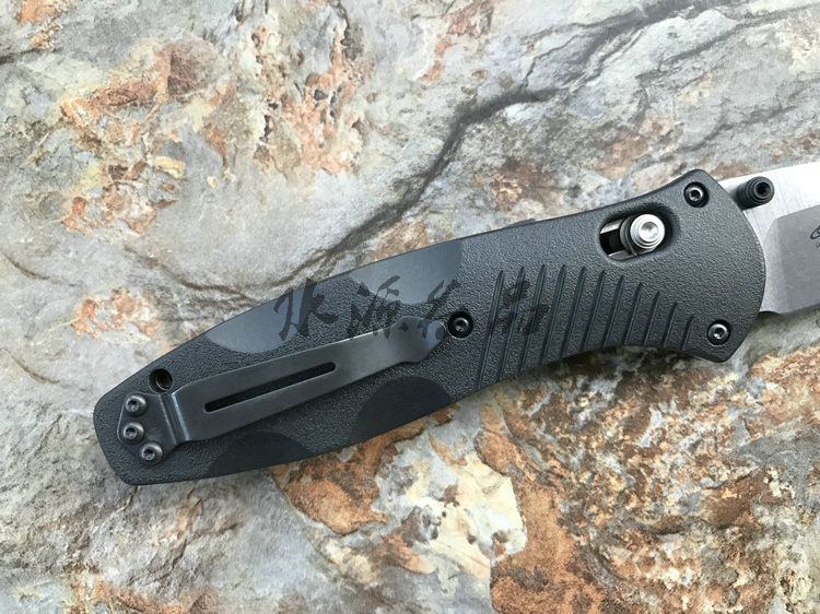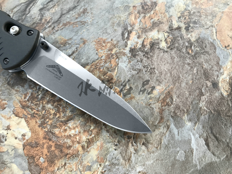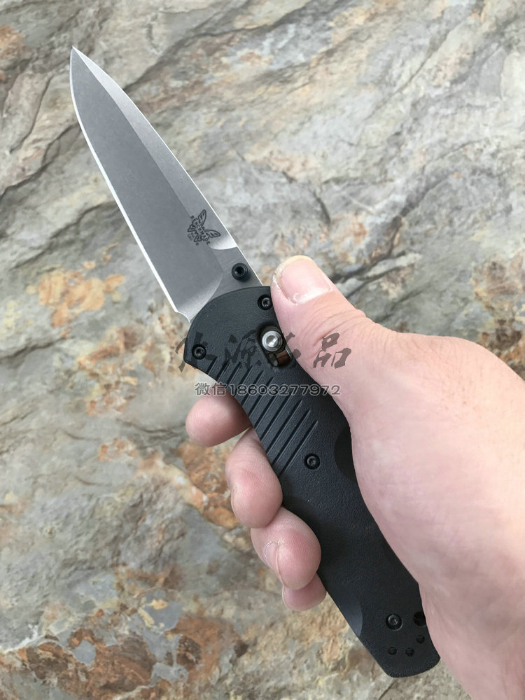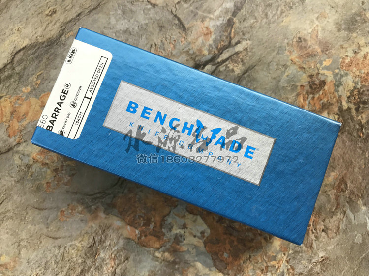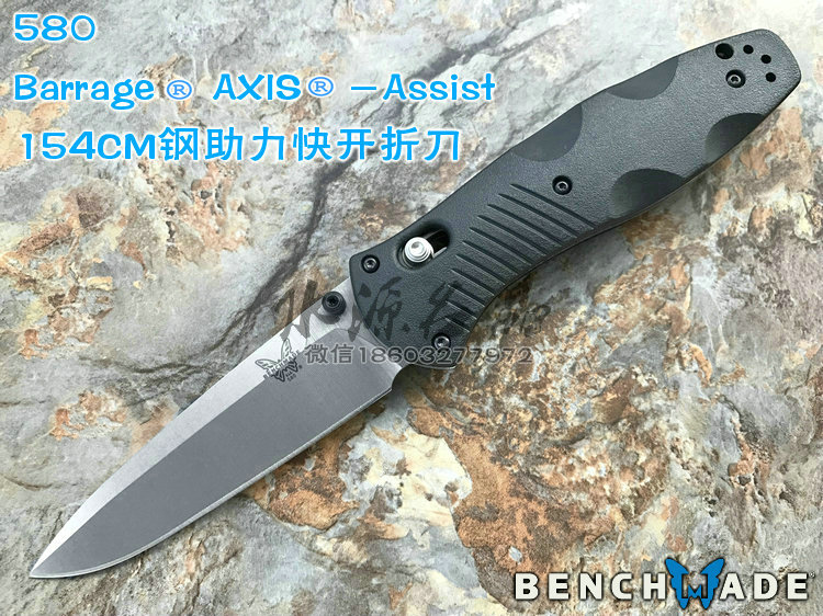 类 型: 折刃 型 号: 580 全 长: 212m 刃 长: 91mm 闭合长度: 121mm 刃 材: 154CM 硬 度: 58-61HRC 表 面: 石洗 刃 厚: 3mm 柄 长: 121mm 柄 材: G10+420J 锁 型: 轴锁,AXIS® 重 量: 122g 原产地: 美国 "Barrage" 助力快开折刃是第一把运用 AXIS-Assist? 半弹结构的折刃。AXIS? 轴卡榫一直是 Benchmade 最引以为傲的发明,也受到市场热列欢迎,因此Benchmade持续研发改良,推出 AXIS-Assist? 半弹结构。 有 AXIS-Assist? 半弹结构的折刃,只要将刃刃向外推出一小段距离,内部的弹簧就会启动施力,使刃刃迅速弹出到位。要解锁收到,只要照一般使用 AXIS? 轴卡榫的方法即可,相当简单。而且握柄上方设有安全锁,展刃、收合时都可上锁,安全性无虞。