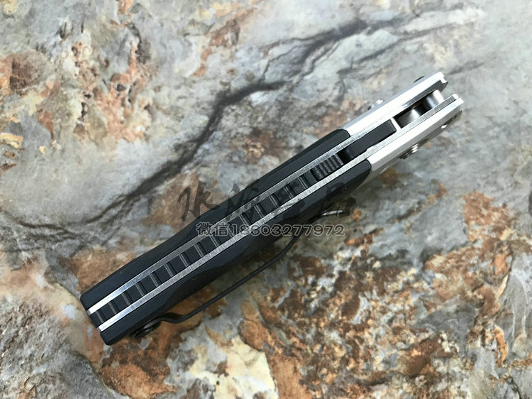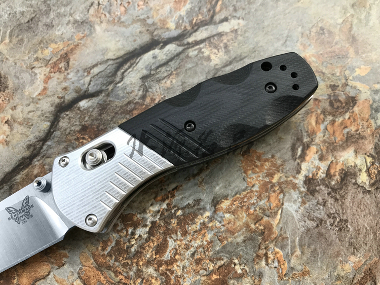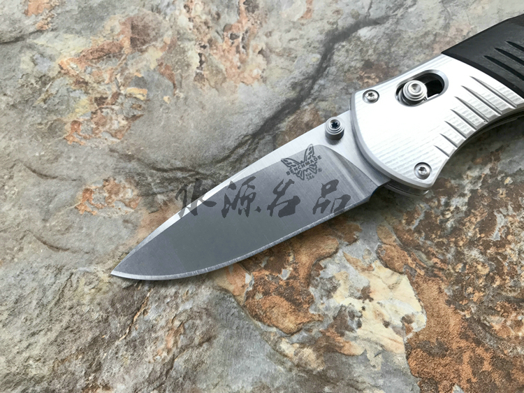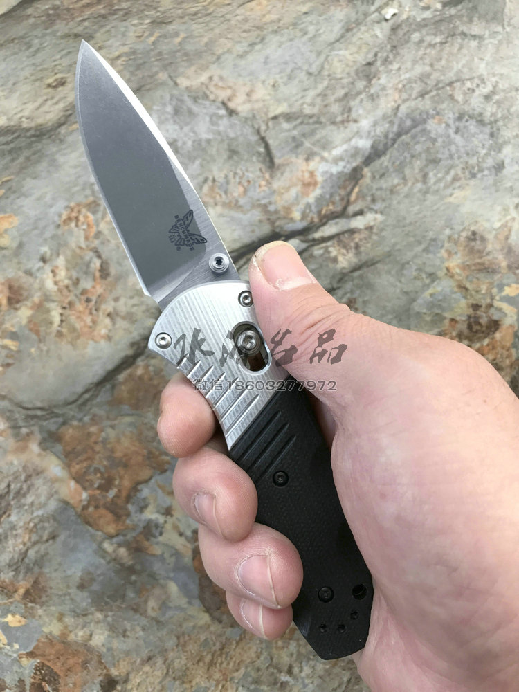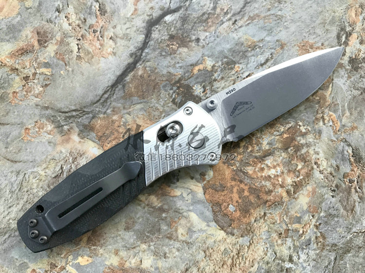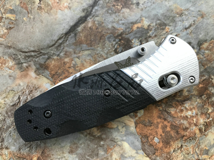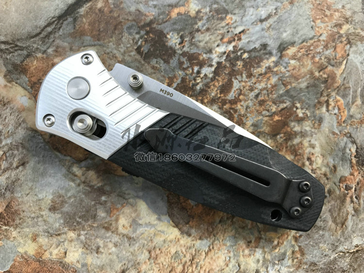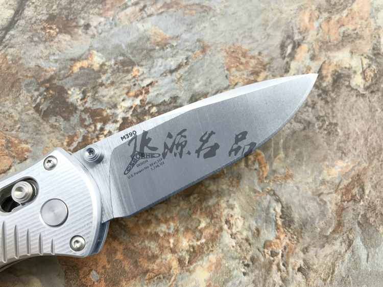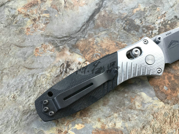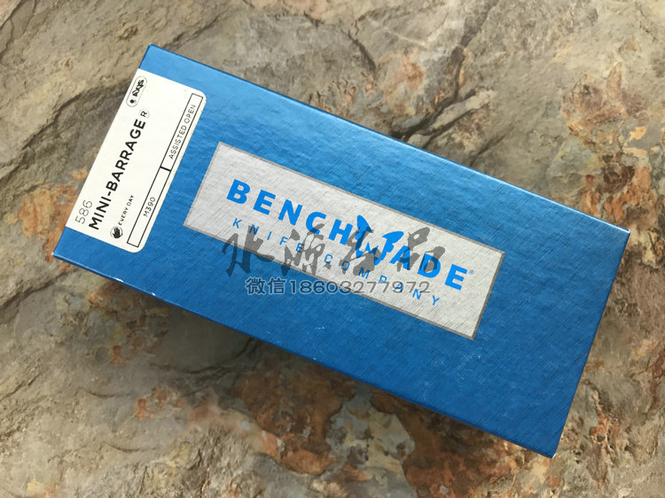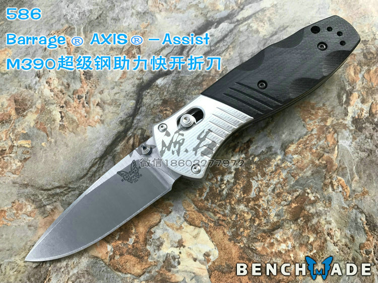 类 型: 折刃 型 号: 586 全 长: 175.5m 刃 长: 74mm 闭合长度: 101.6mm 刃 材: M390超级钢 硬 度: 61-62HRC 表 面: 石洗 刃 厚: 2.55mm 柄 材: G10/Aluminum+420J 锁 型: 轴锁,AXIS® 重 量: 110g 原产地: 美国 "Barrage" 助力快开折刃是第一把运用 AXIS-Assist? 半弹结构的折刃。AXIS? 轴卡榫一直是 Benchmade 最引以为傲的发明,也受到市场热列欢迎,因此Benchmade持续研发改良,推出 AXIS-Assist? 半弹结构。 有 AXIS-Assist? 半弹结构的折刃,只要将刃刃向外推出一小段距离,内部的弹簧就会启动施力,使刃刃迅速弹出到位。要解锁收到,只要照一般使用 AXIS? 轴卡榫的方法即可,相当简单。而且握柄上方设有安全锁,展刃、收合时都可上锁,安全性无虞。
