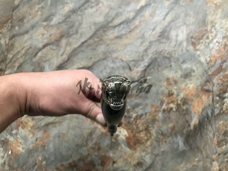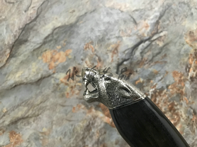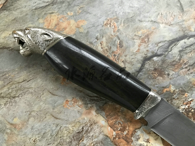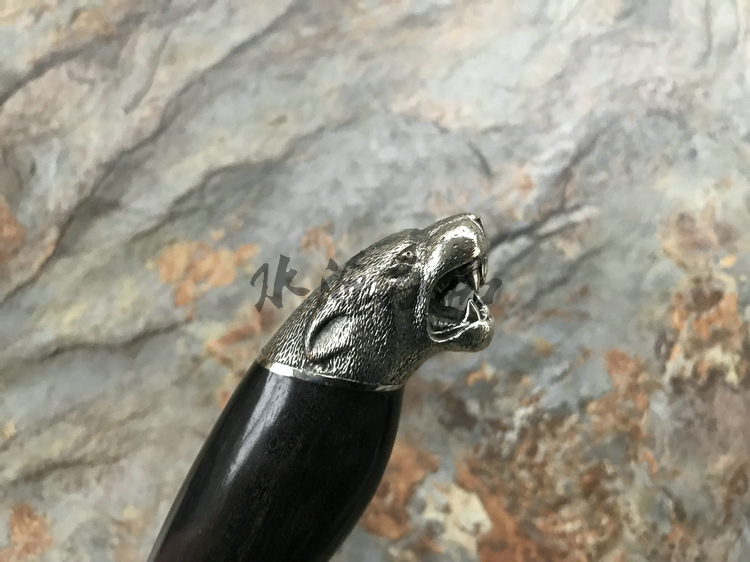 手柄为黑色铁木打磨而成,符合人体工学握持感绝佳。护手及尾部为黄铜手工雕刻表面镀银做旧,虎头虎虎生威体现了刀匠极高的技艺。