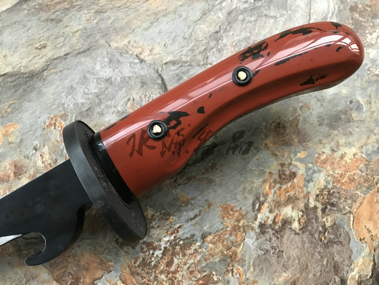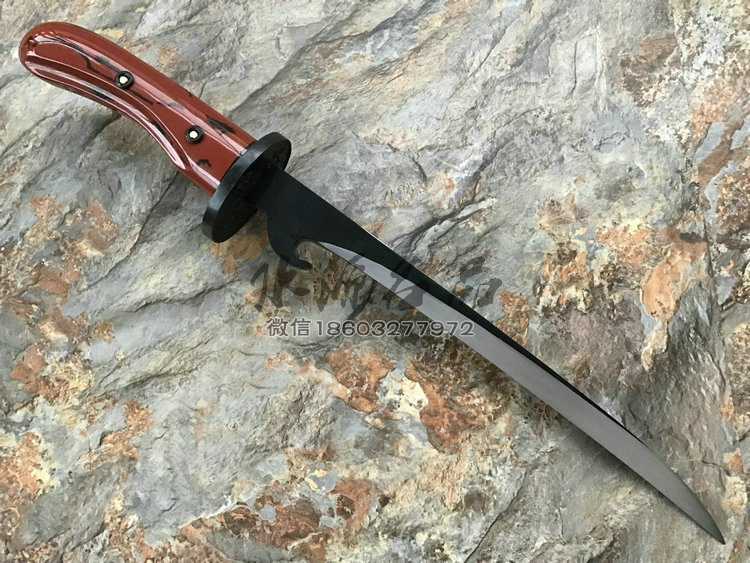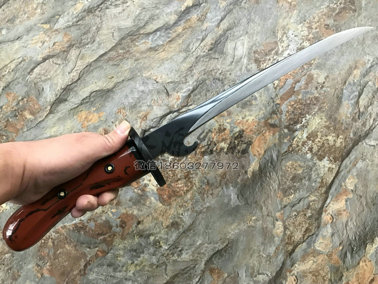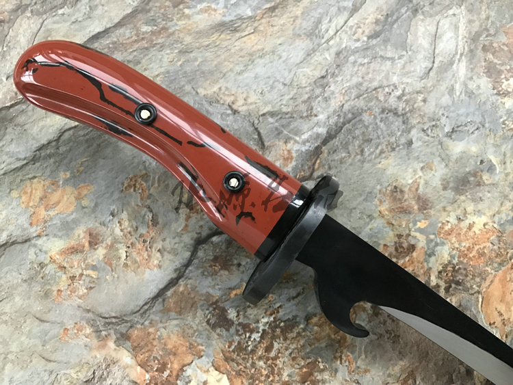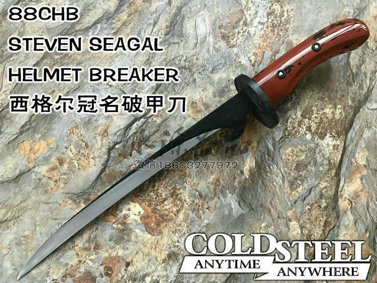 类 型: 直刃 型 号: 88CHB 全 长:495mm 刃 长: 335mm 刃 材: 1090 High Carbon 硬 度: 59-60HRC 表 面: 拉丝+涂层 刃 厚: 11mm 重 量: 744g 含鞘942g刃 鞘:木漆 这是美国冷钢公司新出品的穿山破甲刀,由动作巨星武术专家西格尔(合气道七段)精心复原的一款古代日本忍者使用的古董武器,此物主要功能是砸碎头盔,其刺点能轻松的穿透对方铠甲而出名,刃根部翘起的部分可以招架和抵挡对方的武器。包括鞘与装具都是完全复刻了古董的形制,作为冷兵器的收藏,这也是一个不可多见的品种。