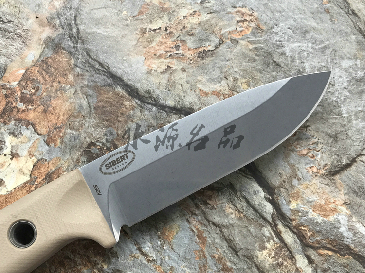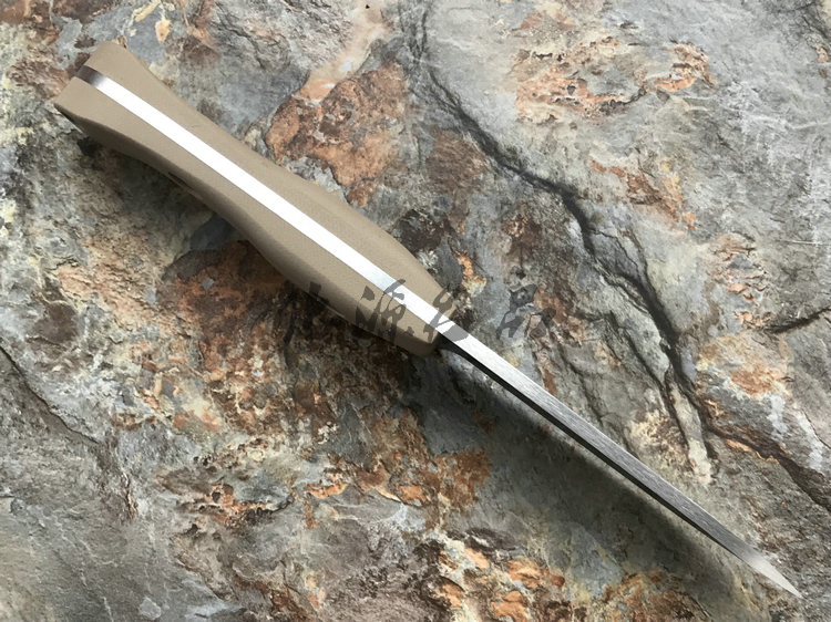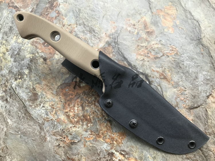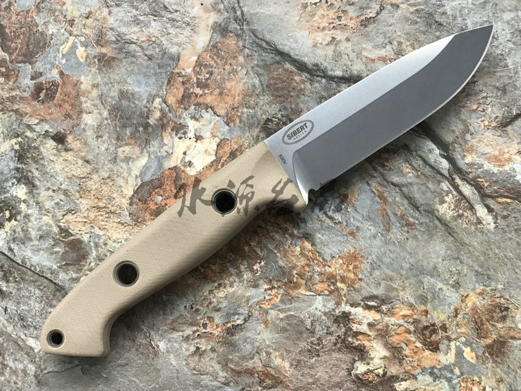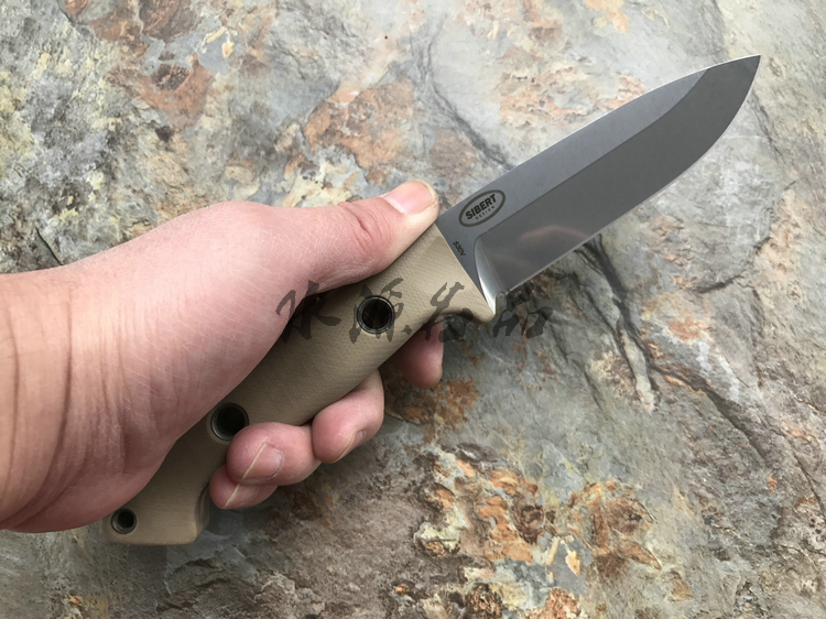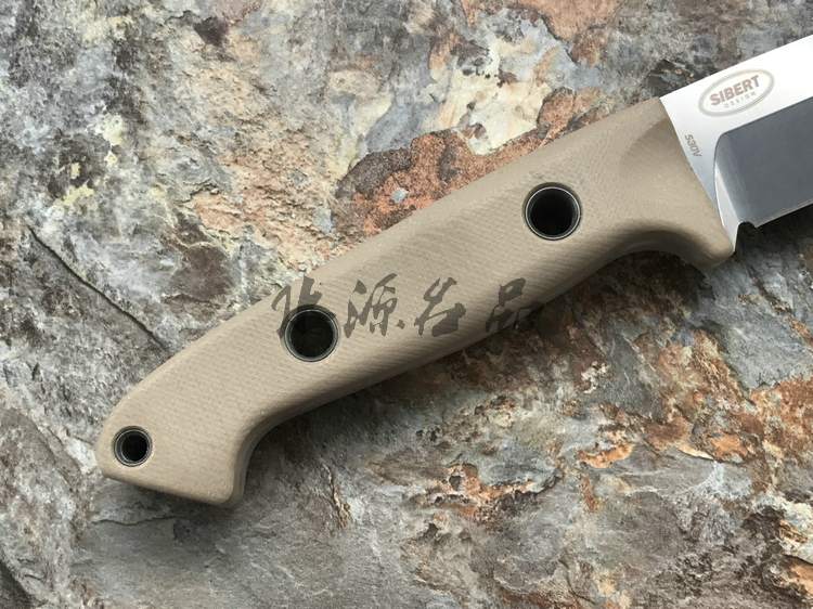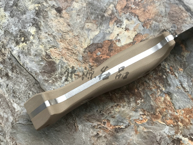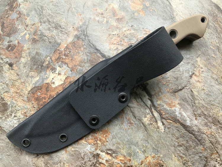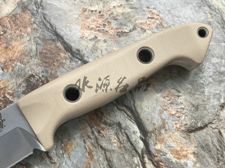 一体式刃柄让这把刃具更加强壮有力,外侧使用手波状外形的沙色G-10贴片。柄部使用钛管进行贯穿,既有效的降低了刃身重量,又让使用者在握持时可以散热,防止出现手部出汗而造成刃具脱手现象的出现。刃具尾部拥有系绳孔,刃具配有K鞘更加方便快捷使用,