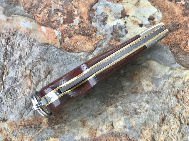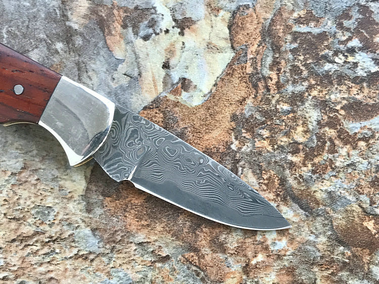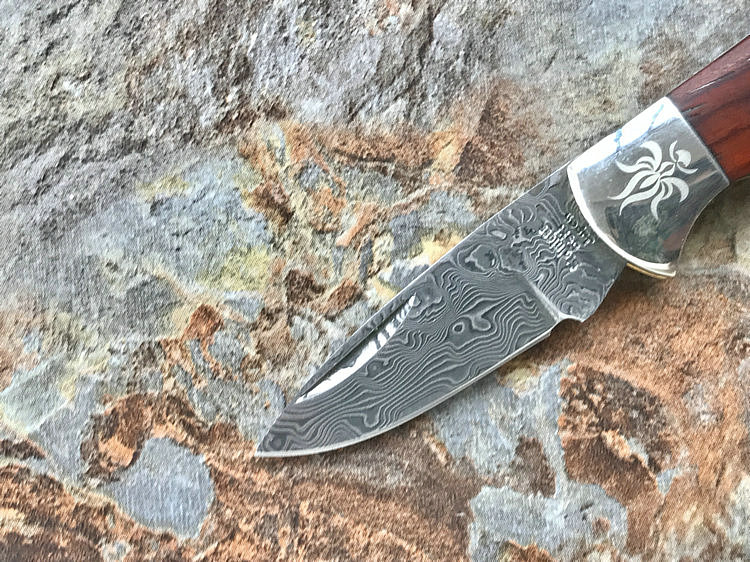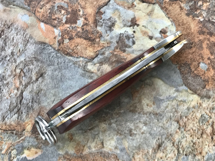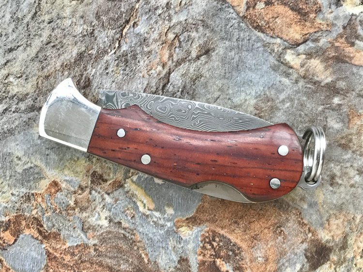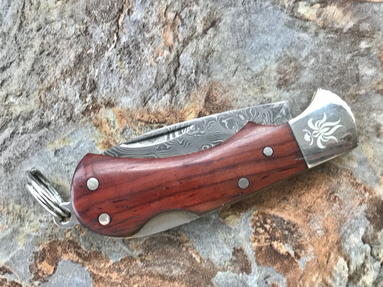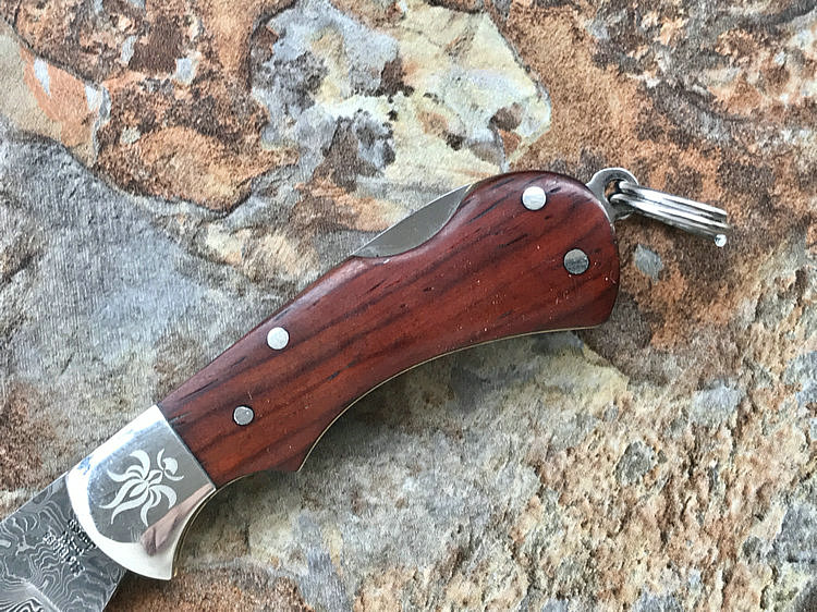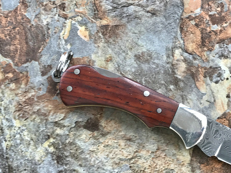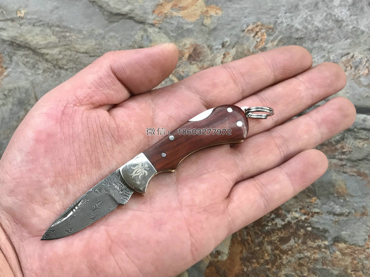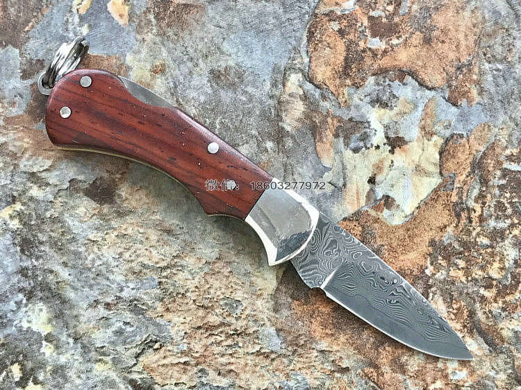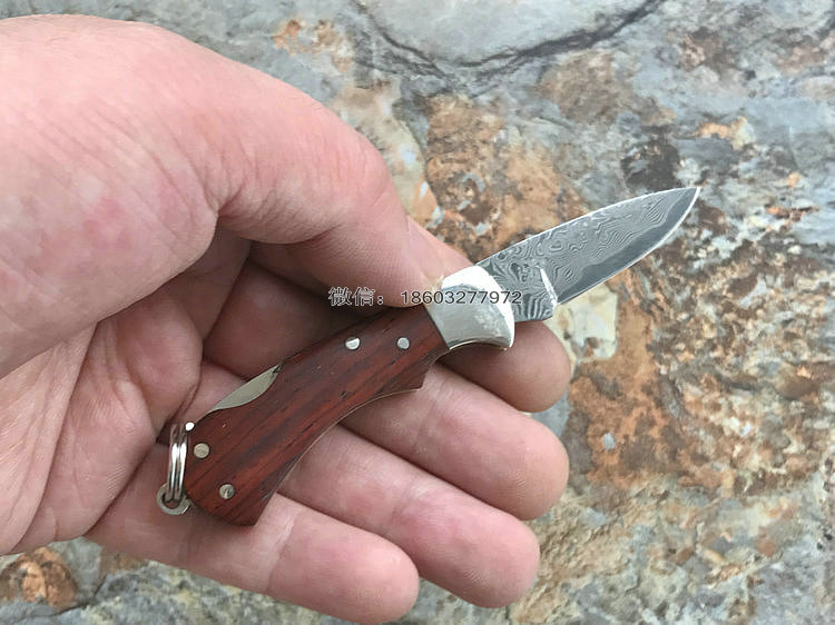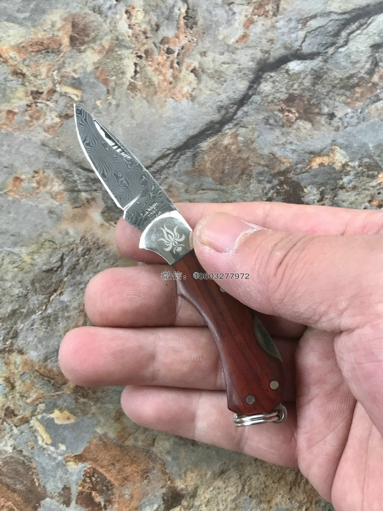 该款小粹折刀做工精巧 刀刃采用VG-10核心31层大马士革夹钢性能卓越外观漂亮,手柄采用黄檀木日常把玩可盘玩出精美效果。尾部有尾环可以挂在钥匙扣上方便携带!