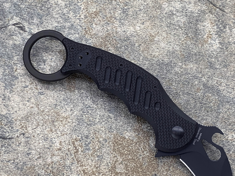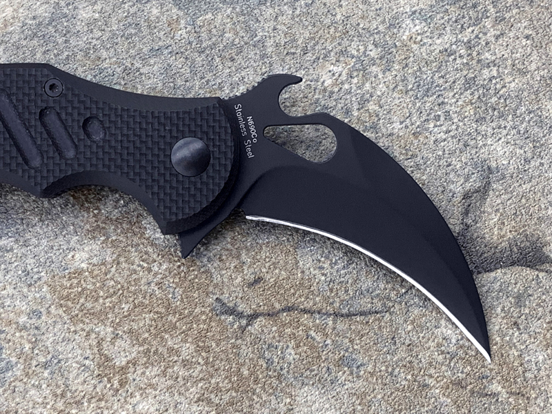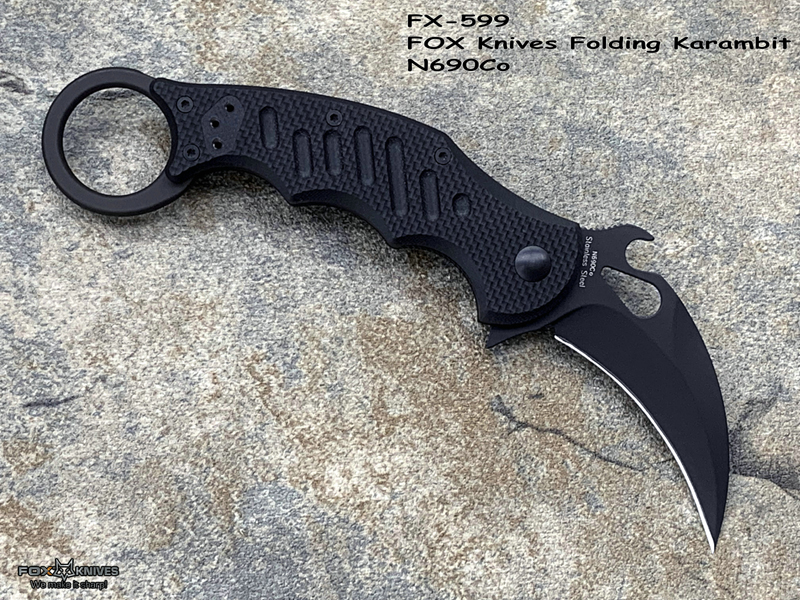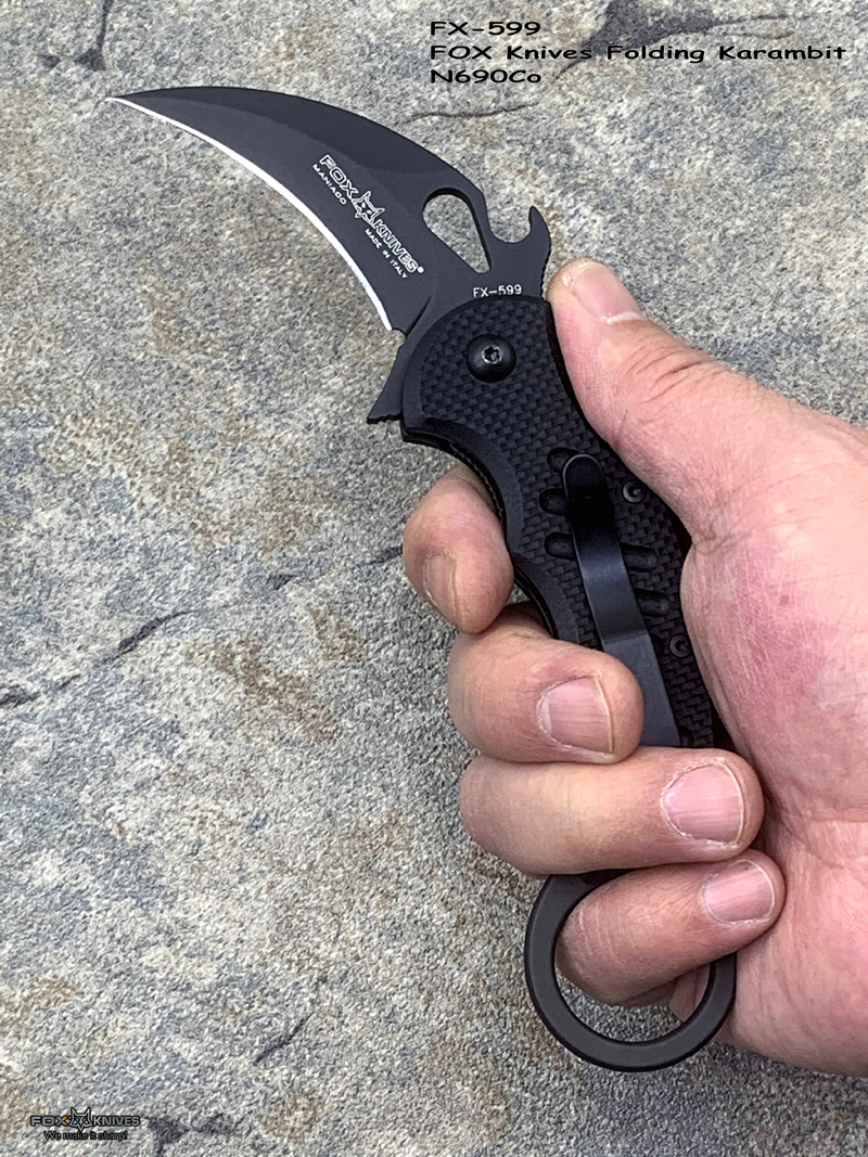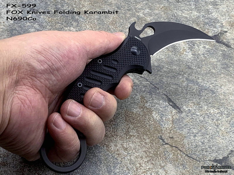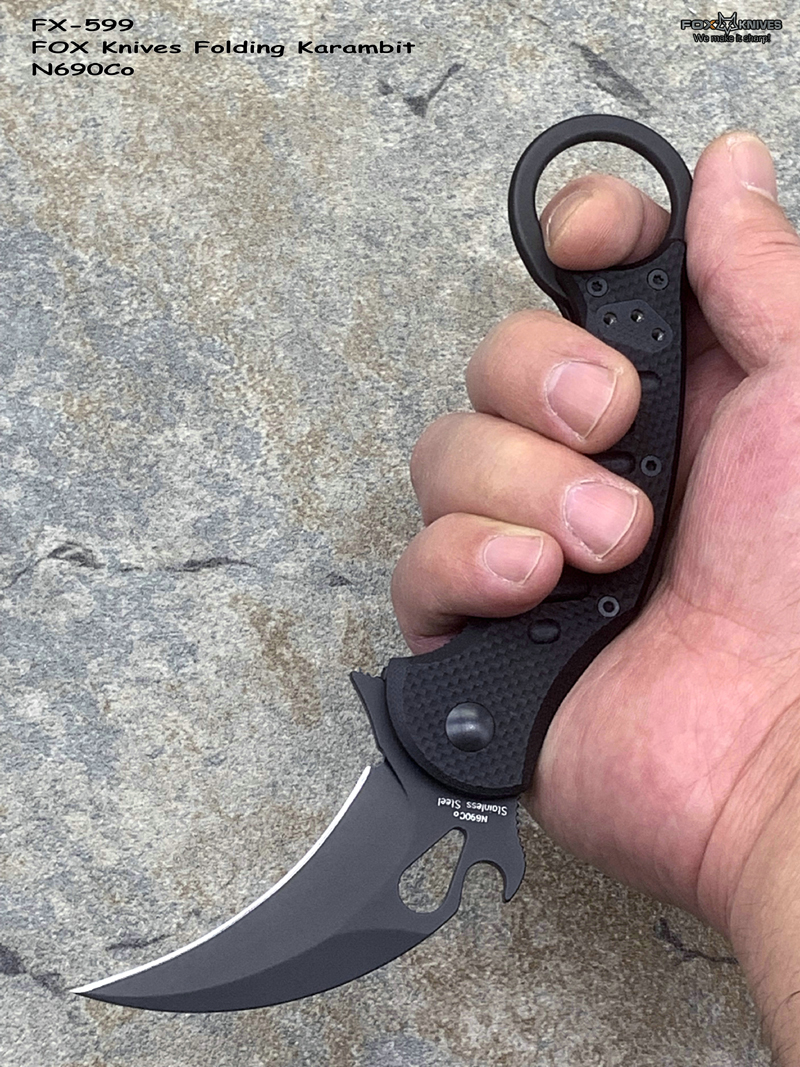 FX-599 G10柄 Karambit 快开钩 Fillper快开 折叠爪刀,FX-599 Karambit是FOX刀具最新的产品 此款更适合亚洲人的手型刀刃材质选用优质的N690不锈钢,表面黑色涂层:具有很强的防腐、防摩擦、防水性能的聚四佛乙烯上添加一层黑色BI涂层,硬度58-60HRC,加上快开钩设计与Fillper功能 可轻松单手开启。