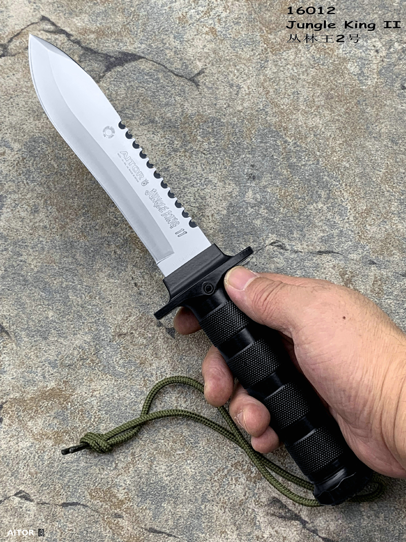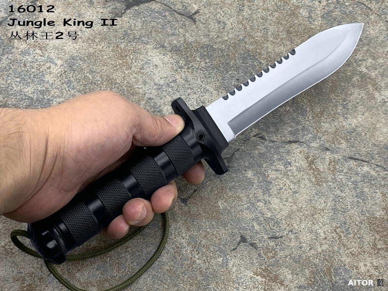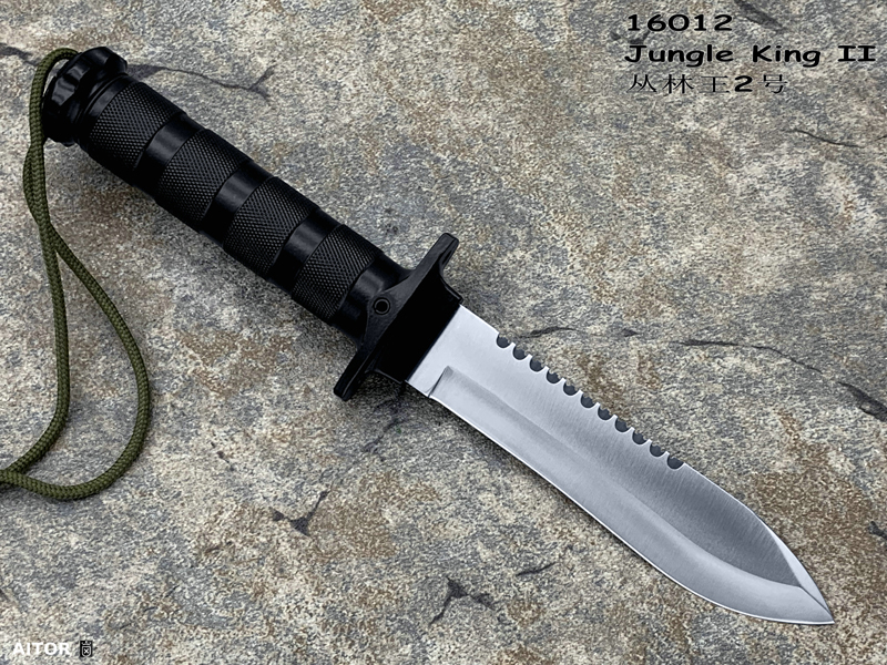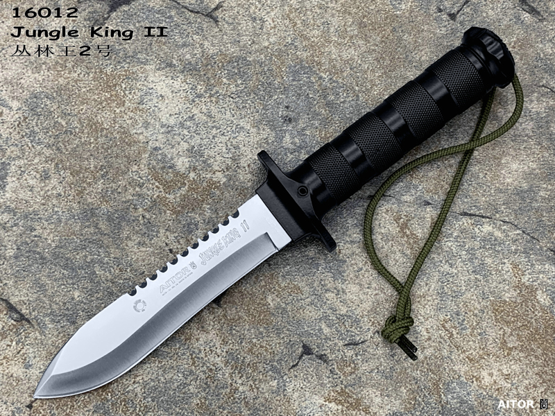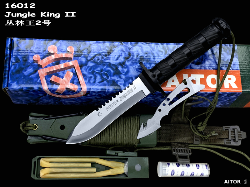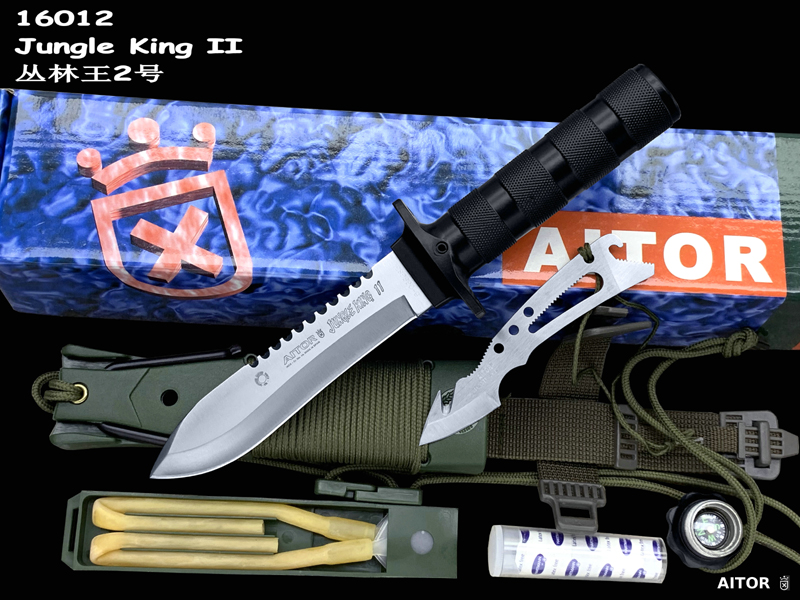 “丛林王”求生刀在奥托公司的产品中属求生系列产品(生存) ,是多功能,多用途求生组合刀,按尺寸大小和附件数量分一,二,三3种型号。