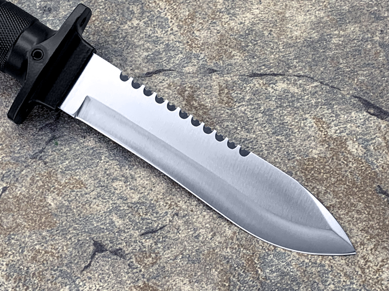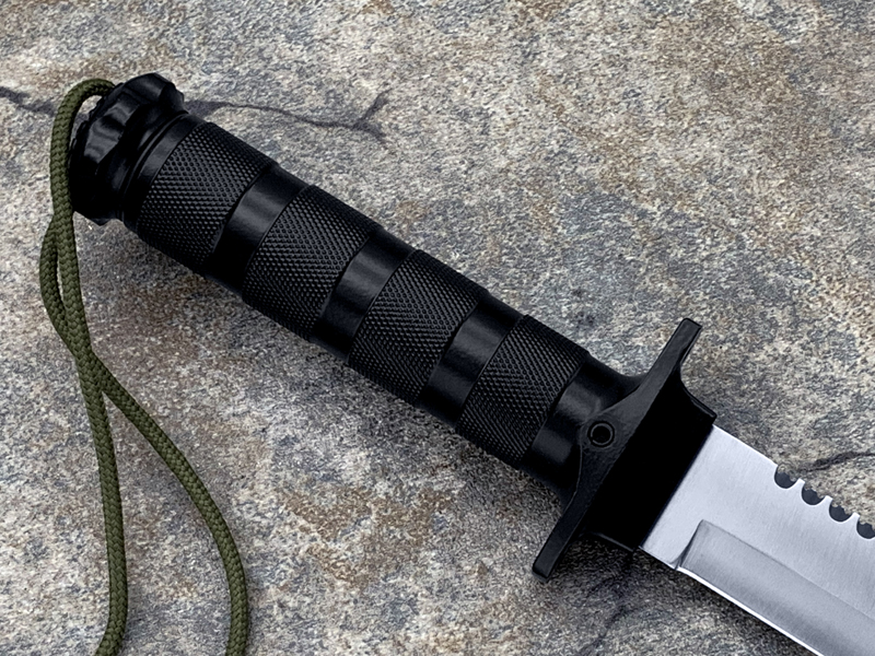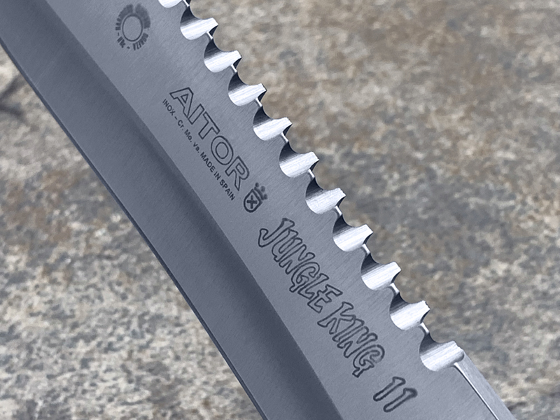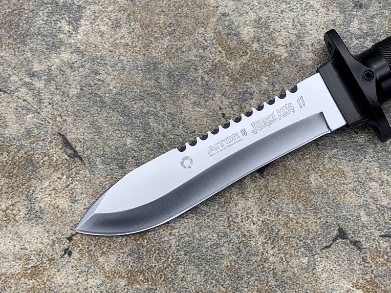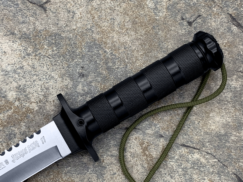从整体外形来看, “丛林王”二型的刀型为匕首型,刀背接近刀头处有一段开锋,同样带有背齿,特重于穿刺。刀柄为铝合金制空心管,内藏求生装备,并具防水功能,为该系列刀具次高档型号。刀刃以铆接方式固定在刀柄上,其上刻有品牌,型号,出产编号等。