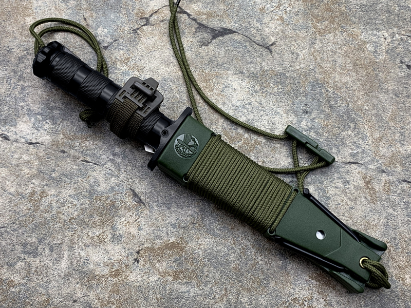 1.附刀:主要用于剥皮,割断细而坚韧的绳子如降落伞绳等。附刀上的圆孔可穿绳子绑在树枝上,使附刀变成长矛。附刀尾端可用当开罐器或开瓶器,还有可当一字螺丝起子的尖端。 2.求生装备组:装置在刀柄内的小塑胶筒,将刀柄尾端旋下即可取出,计有:钓钩,缝针与缝线,消毒刀片,小镊子,确定绷,别针,小铅笔,尼龙细绳。而塑胶筒的另一侧可装药片。